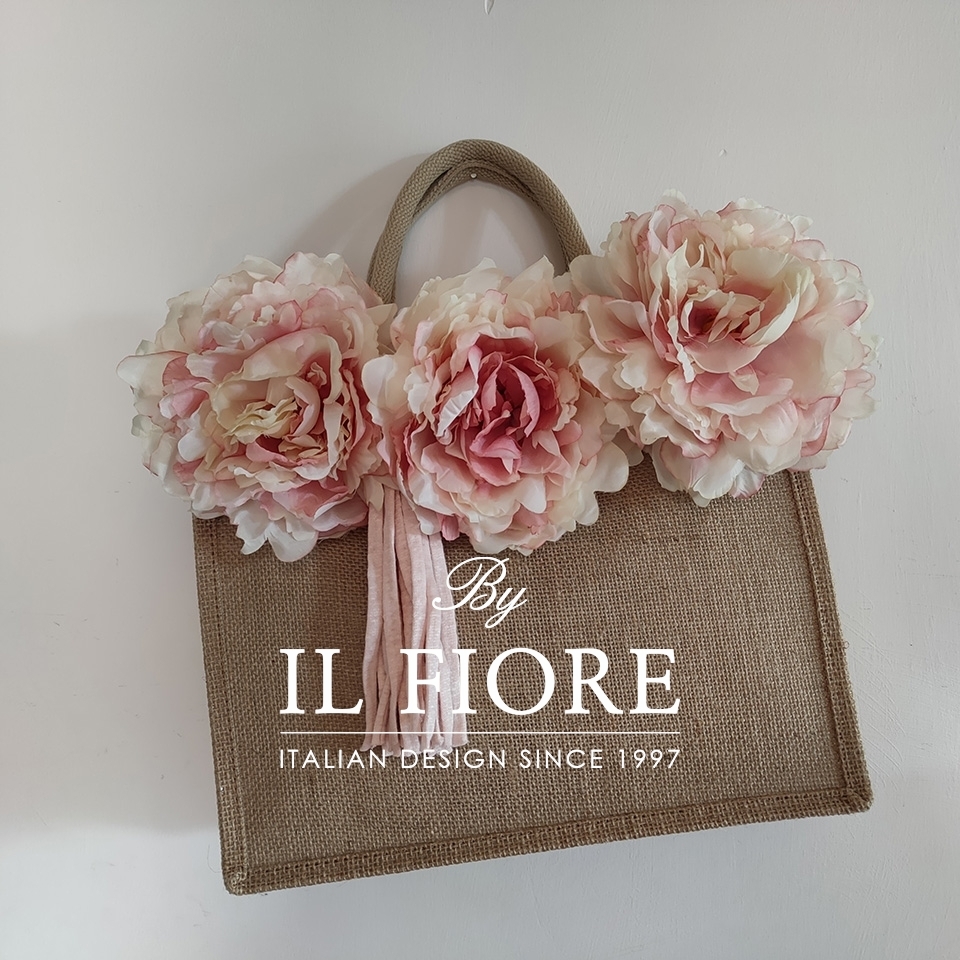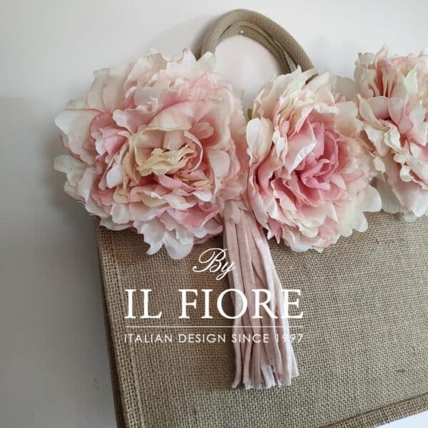 Borsa donna  in juta naturale con manici in juta, decorata con raffinatissimi fiori e nappina rosa cipria, il tutto realizzato a mano. Un accessorio unico da indossare in città di giorno o nelle serate estive. Ideale come originalissima ed esclusiva idea regalo! Nel prezzo è compresa anche la confezione regalo. Bag donna juta