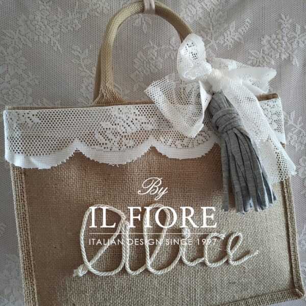 Borsa in juta naturale con manici in juta, decorata con raffinatissimo pizzo e nappina, personalizzabile con nome, il tutto realizzato a mano. Un accessorio unico da indossare in città o al mare di giorno o nelle serate estive. Ideale come originalissima e personalizzata idea regalo! Nel prezzo è compresa anche la confezione regalo. Bag donna juta