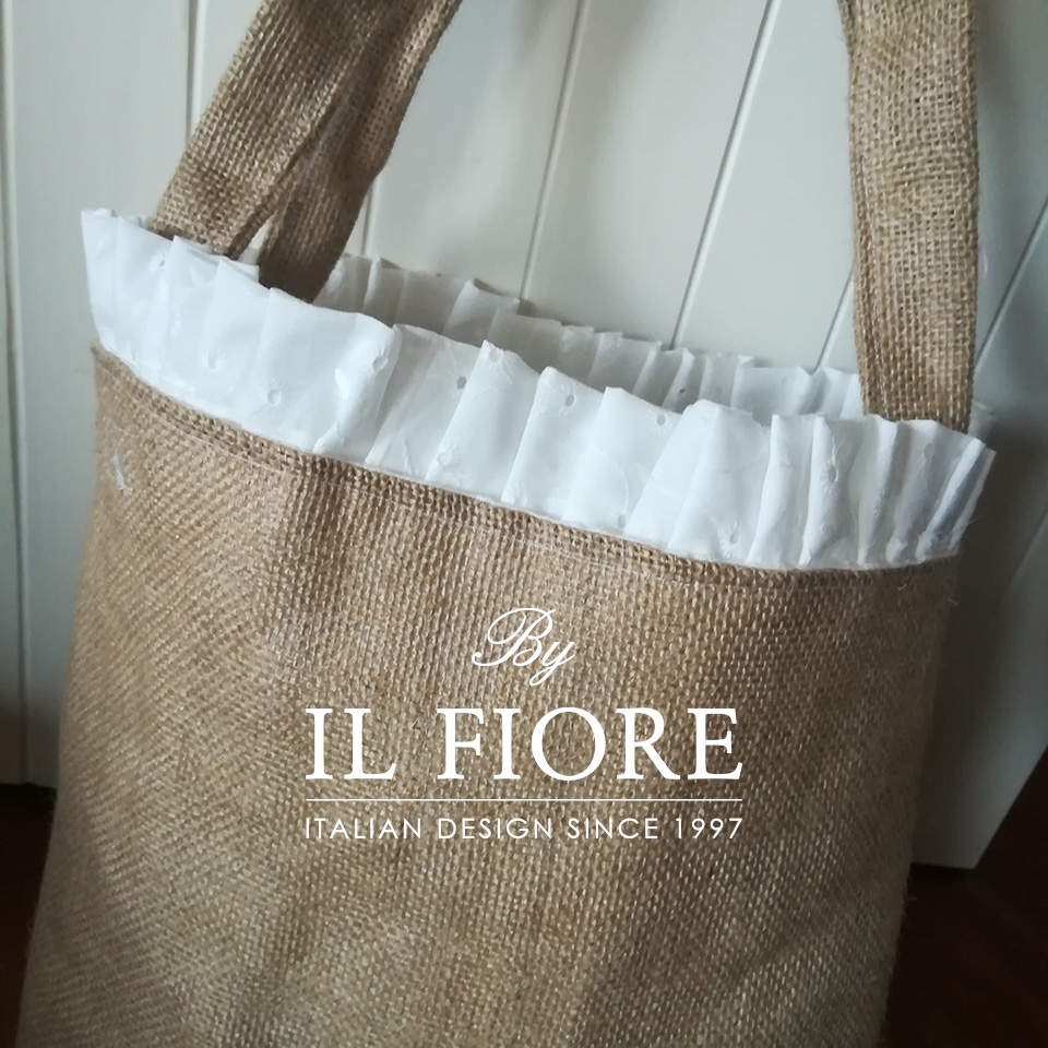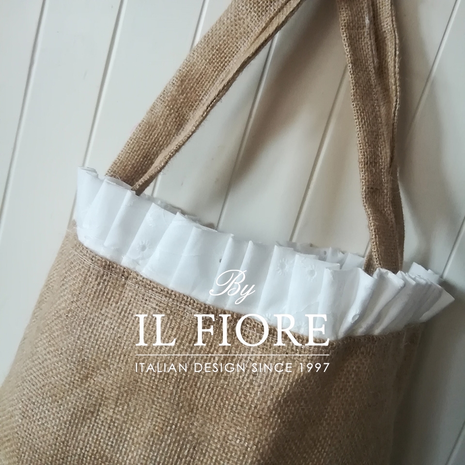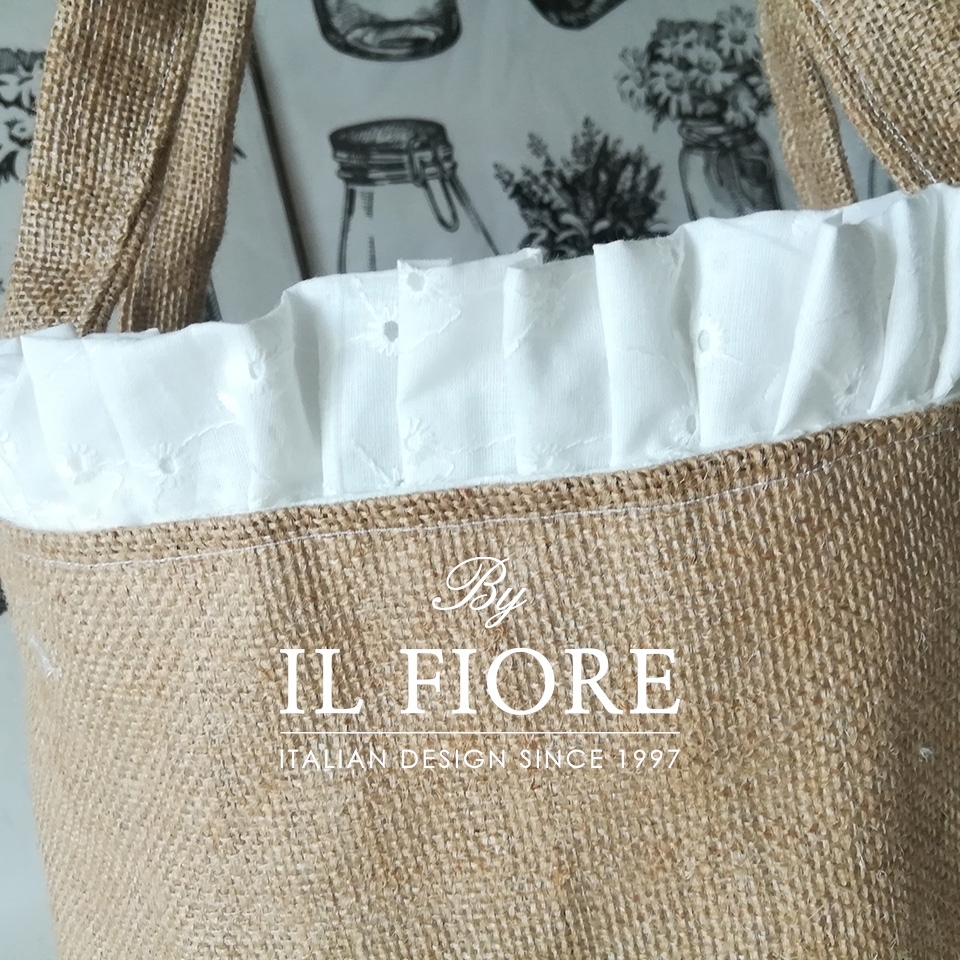 Borsa donna in juta naturale con manici in juta, decorata con raffinatissimo Sangallo, il tutto realizzato a mano.