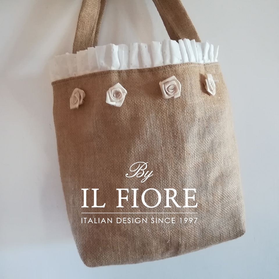 Borsa in juta naturale con manici in juta, decorata con raffinatissimo Sangallo e roselline, il tutto realizzato a mano. Un accessorio unico da indossare in città di giorno o nelle serate estive. Ideale come originalissima ed esclusiva idea regalo! Nel prezzo è compresa anche la confezione regalo. Bag donna juta. Misura cm 30×25.
