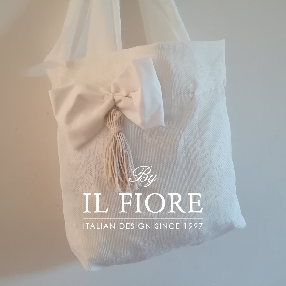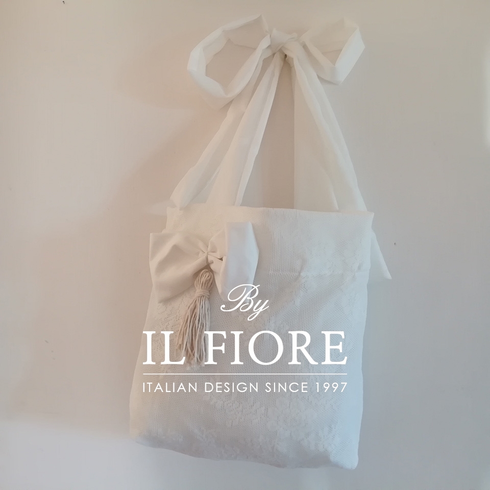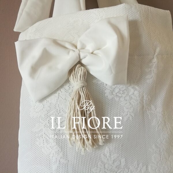 Borsa donna in pizzo con manici a fiocco, decorata con grande fiocco e nappina, il tutto realizzato a mano.