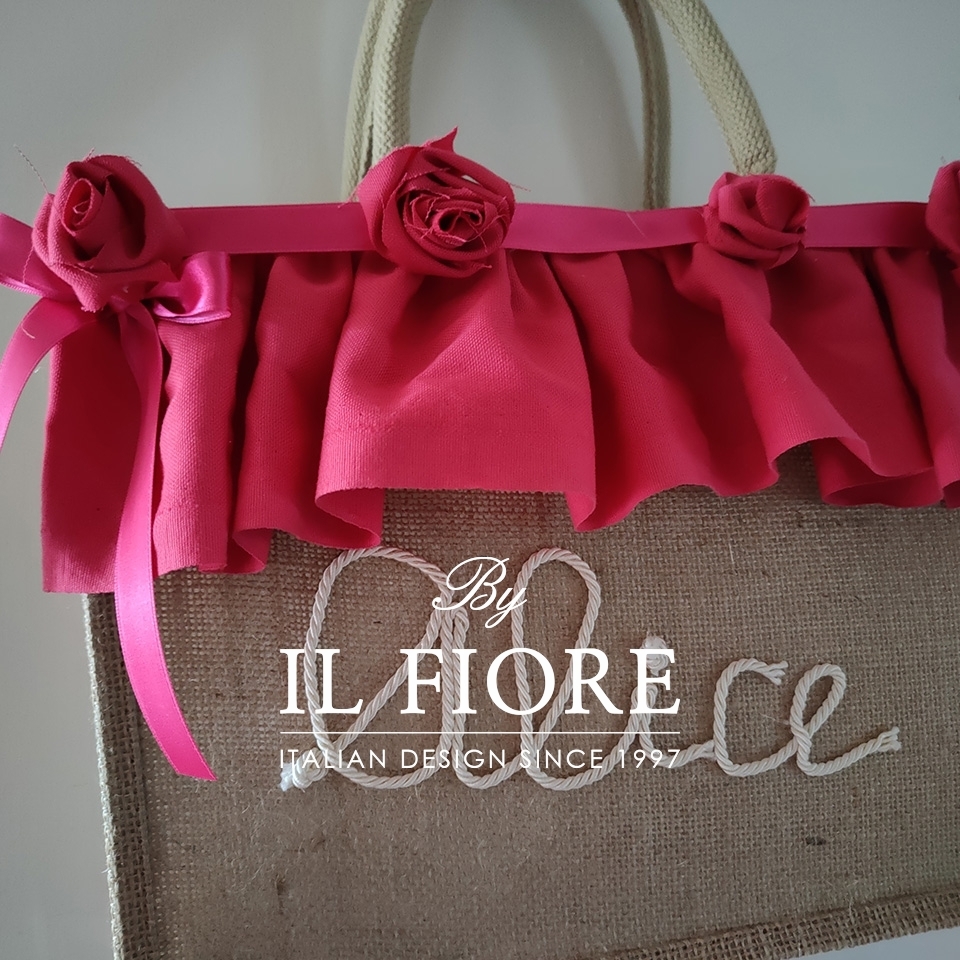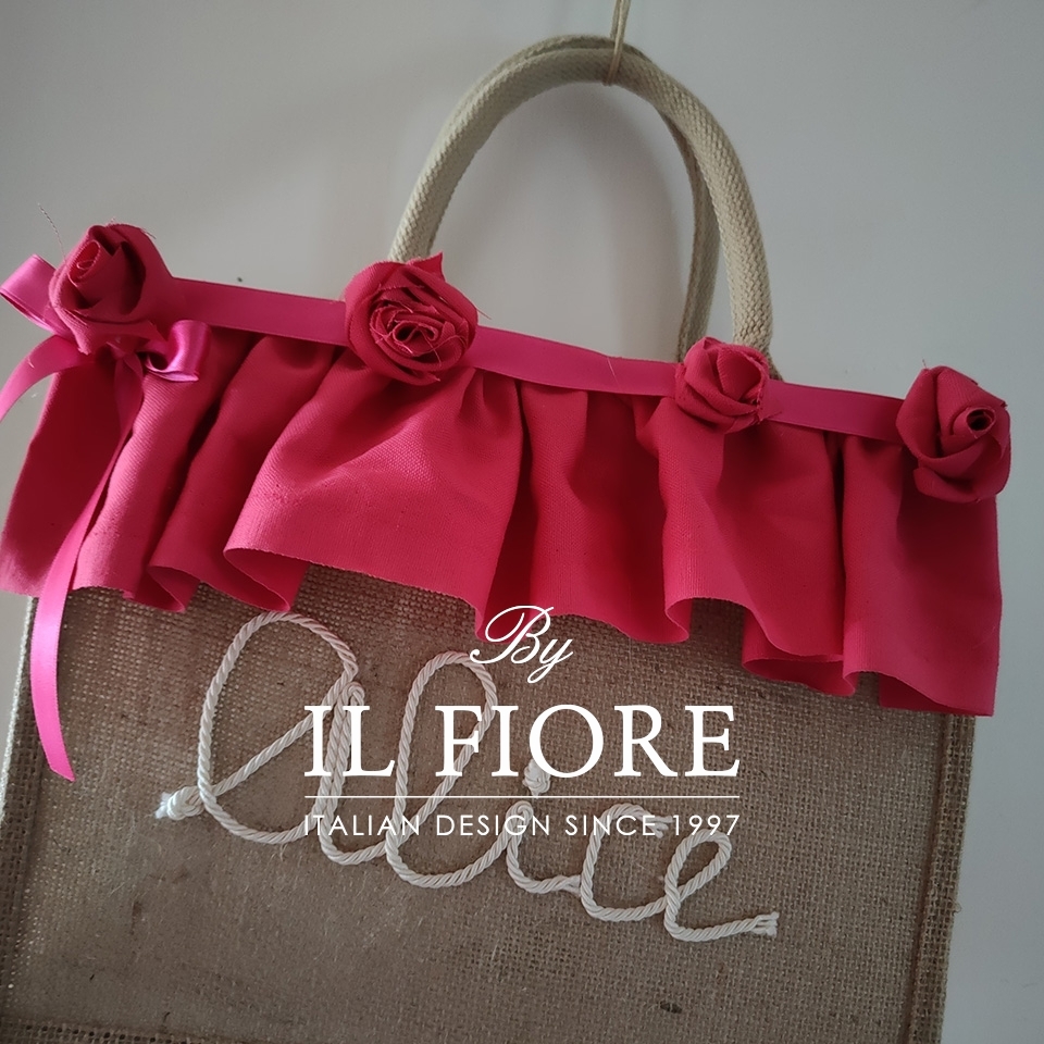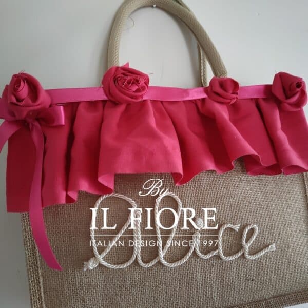 Borse mare donna con nome personalizzabile fiori di stoffa e volant fucsia