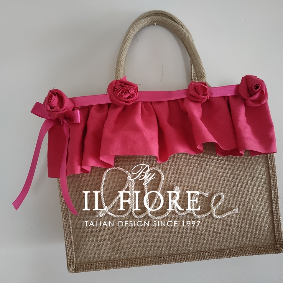 Borsa donna in juta naturale con manici in juta, decorata con raffinatissimi fiori di stoffa e volant fucsia, personalizzabile con nome, il tutto realizzato a mano. Un accessorio unico da indossare in città o al mare di giorno o nelle serate estive. Ideale come originalissima e personalizzata idea regalo! Nel prezzo è compresa anche la confezione regalo. Bag donna juta. N.B. Solo ed esclusivamente per gli articoli da regalo comprese le borse la spedizione è di € 5,00.