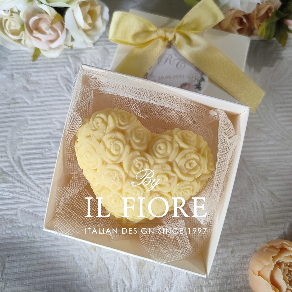 Bomboniera candele decorative a forma di cuore di colore giallo per Matrimonio, Comunione, Cresima e anniversario matrimonio. La bomboniera è confezionata con scatola, nastro di raso e due tipi di cuore con rosa e liscio.