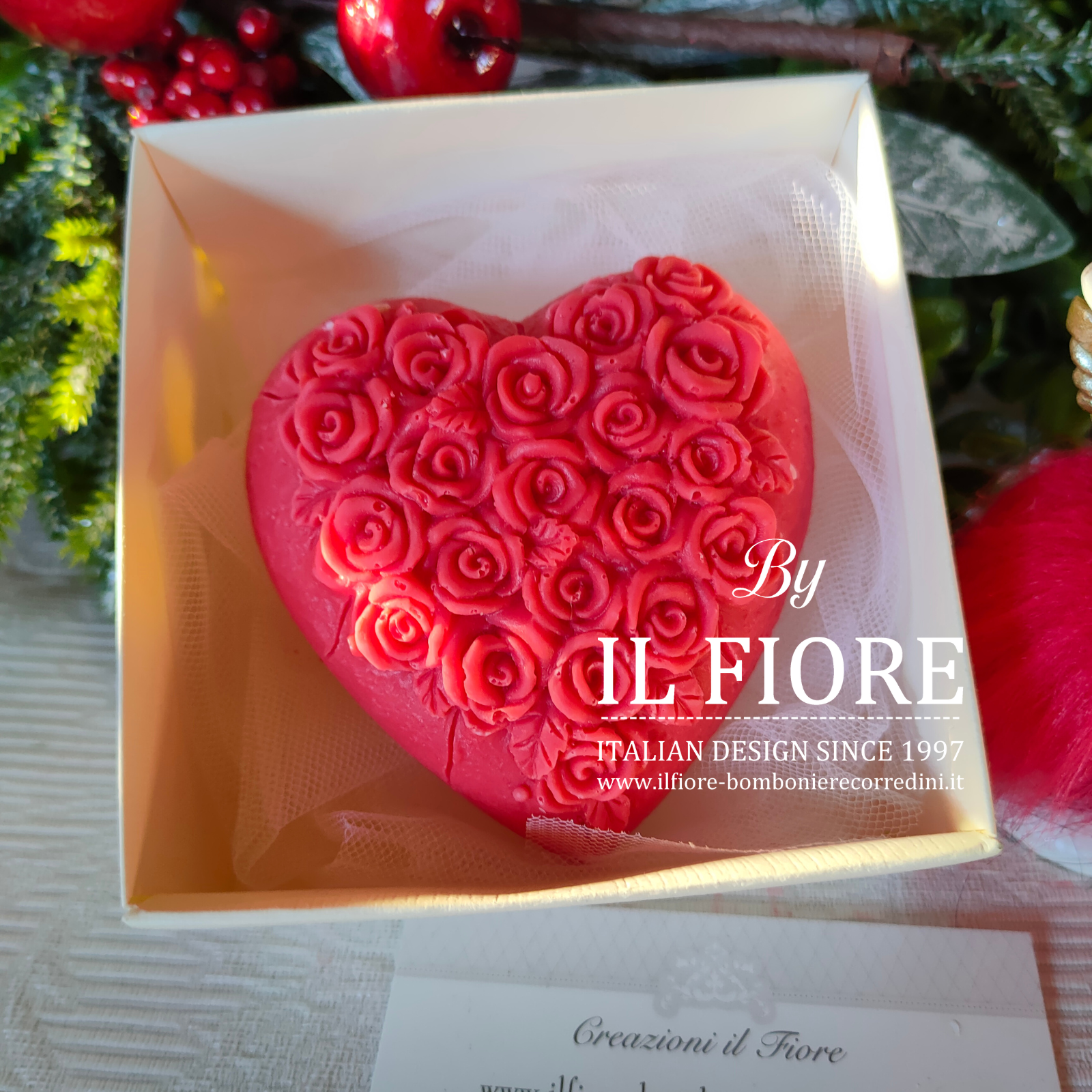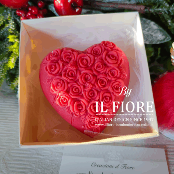 Candela natalizia CUORE CON ROSELLINE con confezione regalo.