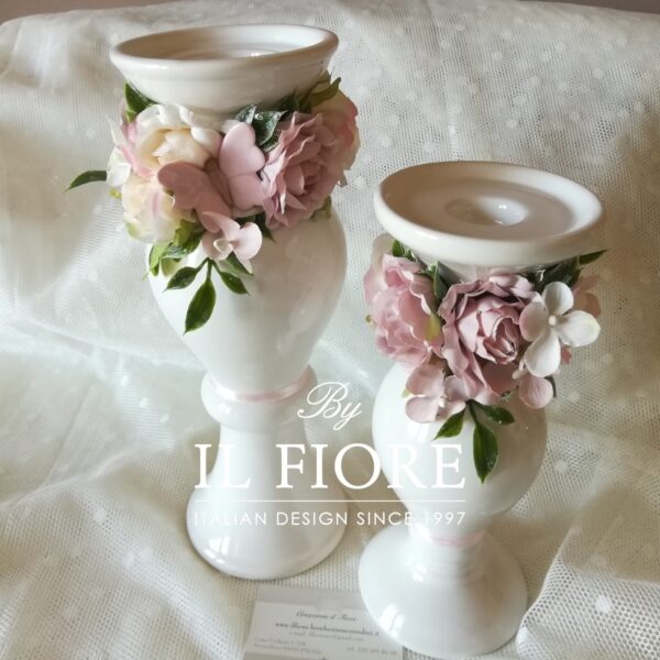 Candelieri in ceramica decorati con fiori, inclusa nella bomboniera scatola , ciuffetto e biglietto in omaggio.