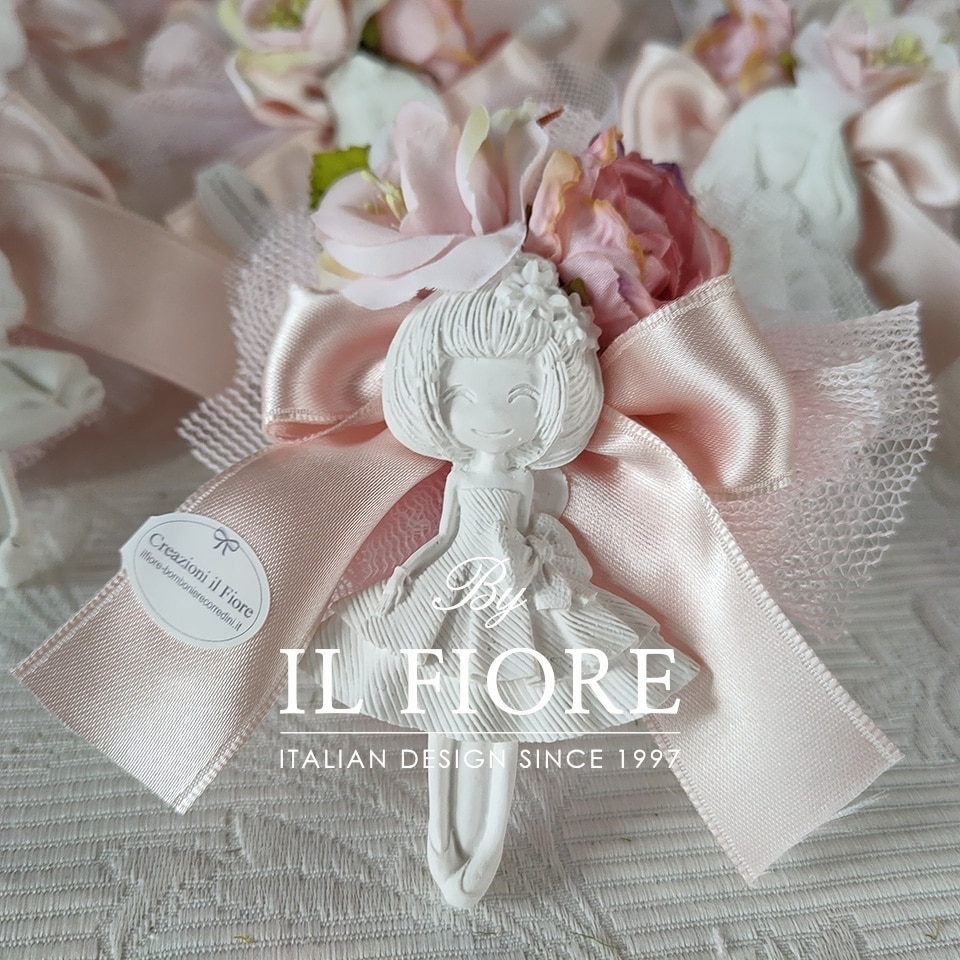 Bomboniera Ciuffetto portaconfetti pouf rosa con fiori, bamboline danza gessetto profumatissimo e nastro di raso.