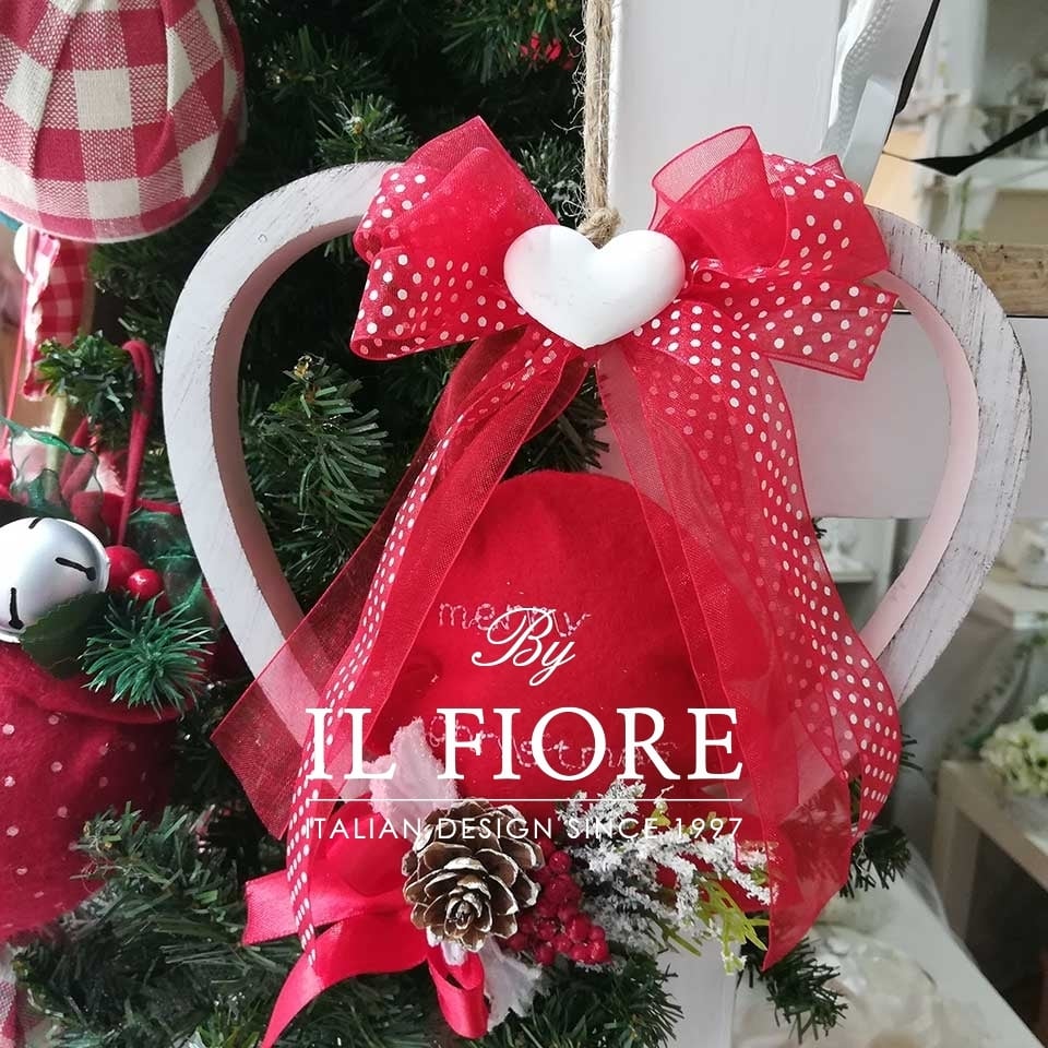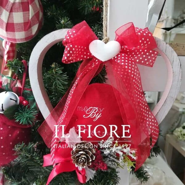 Cuore in legno con albero in panno lenci e scritta ricamata Merry Christmas.
