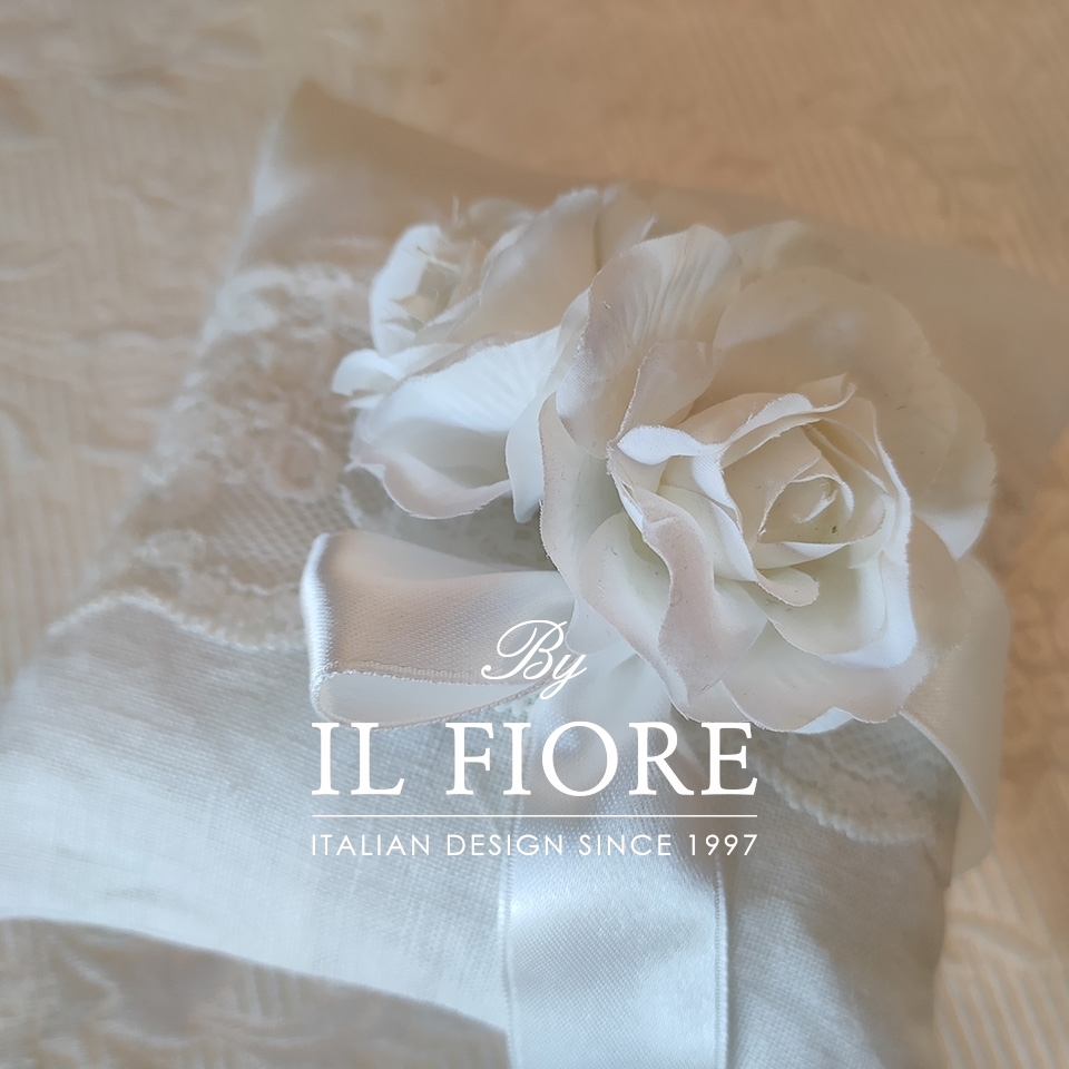Cuscino portafedi con fiori, pizzo e nastro di raso bianco.