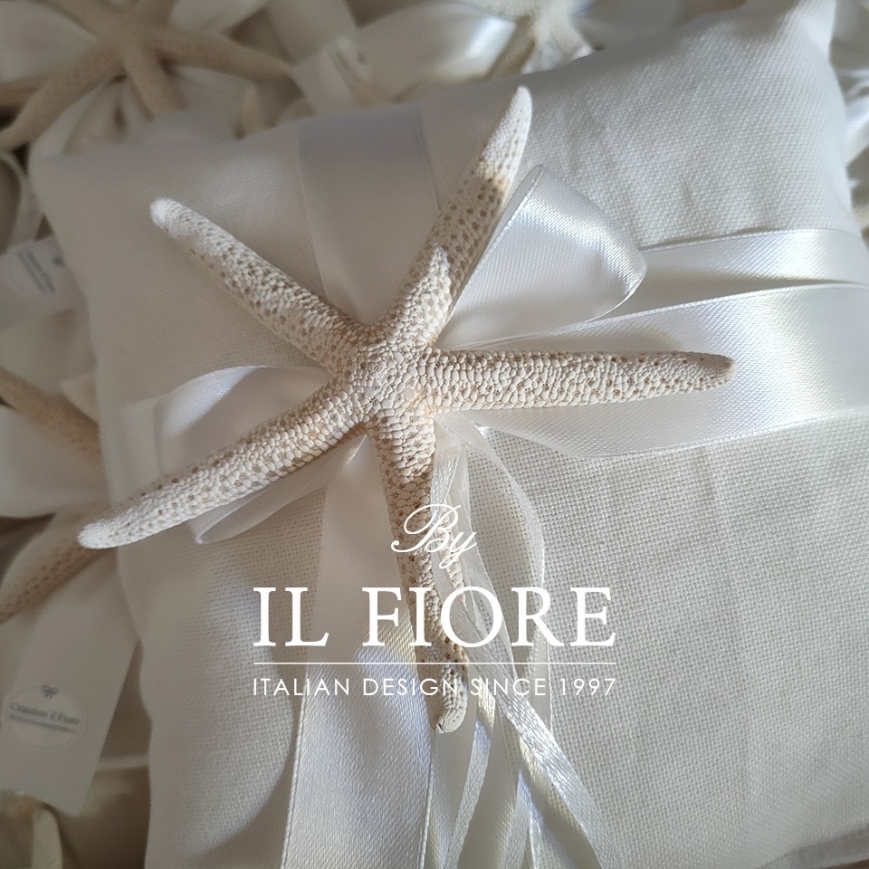 Cuscino portafedi con stella marina in gesso profumatissimo e nastri di raso bianco.