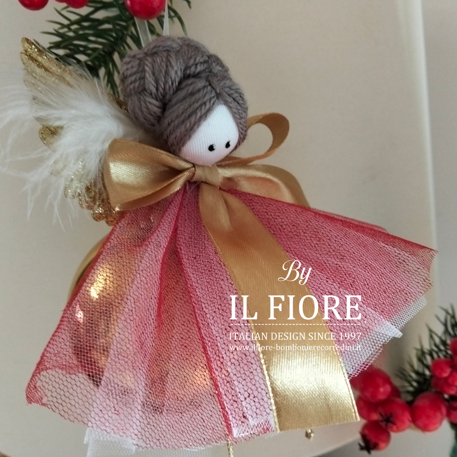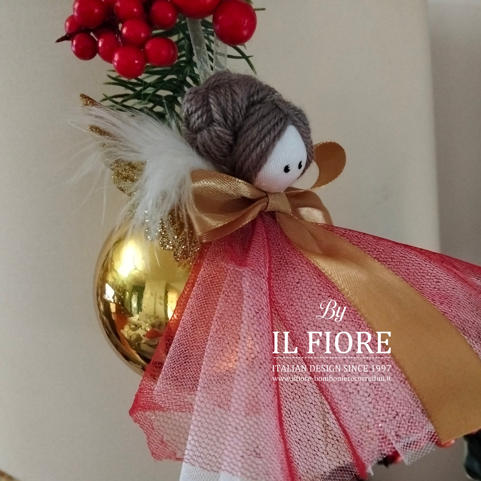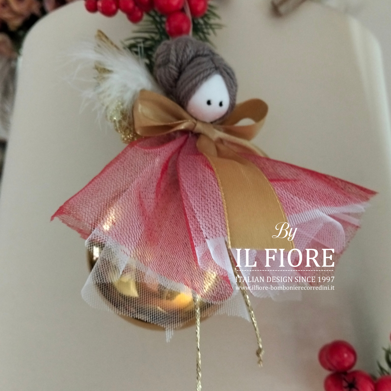 Pallina Natalizia con angelo decorato con vestito rosso in tulle. Compresa nel prezzo confezione regalo.