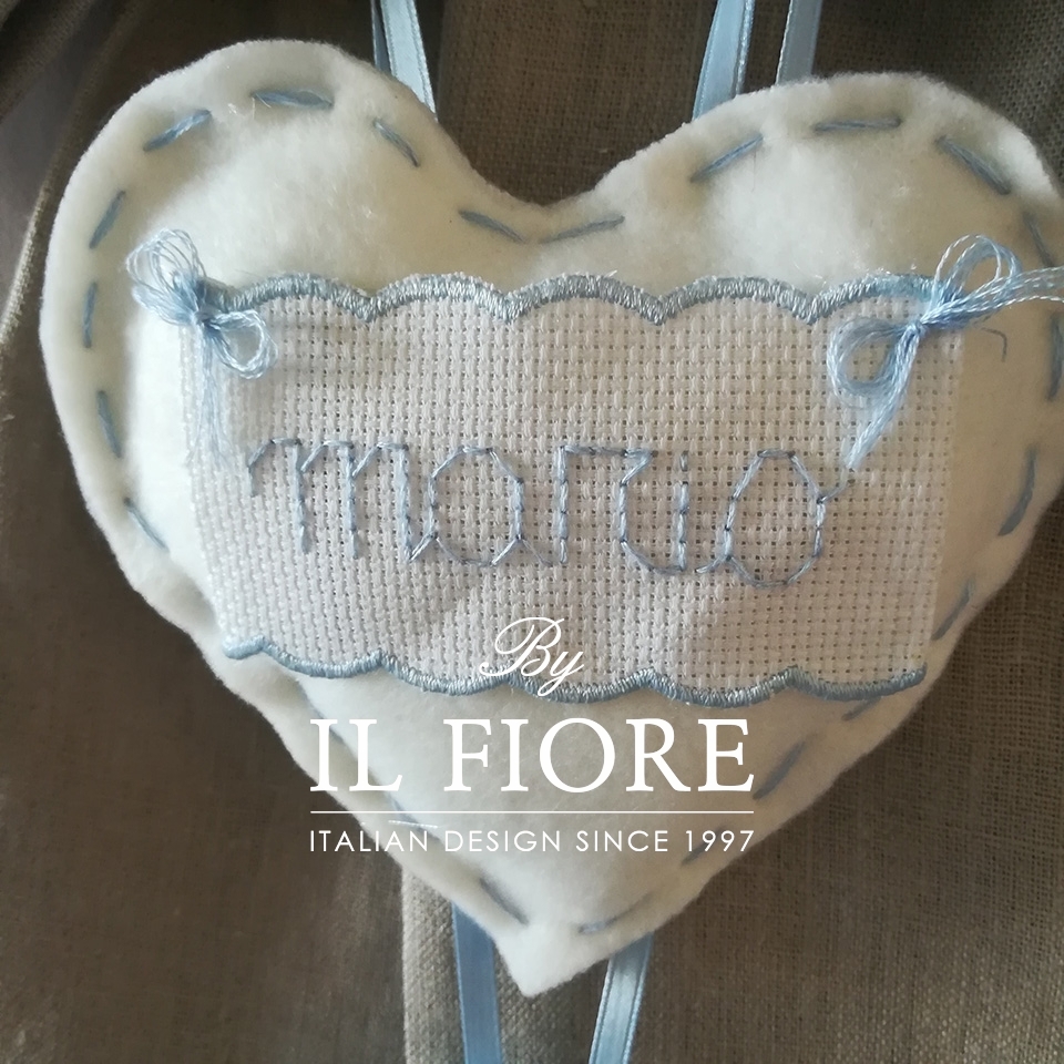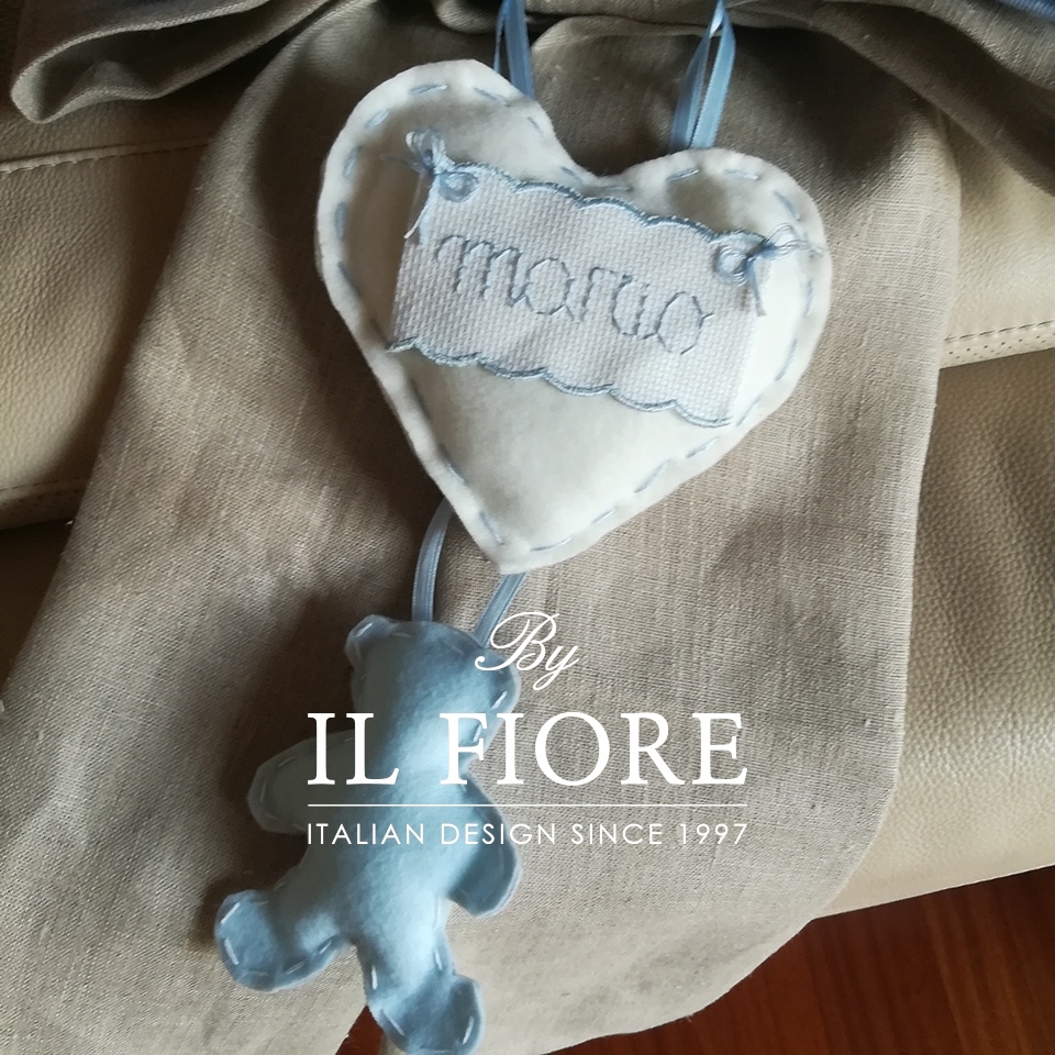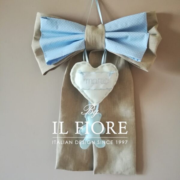 Fiocco nascita bimba e bimbo, in cotone piquet e lino, al centro del fiocco c’è un dolcissimo cuoricino con il nome del bebè ricamato a mano e orso.