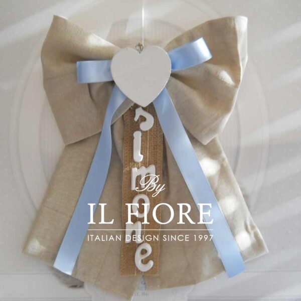 Fiocco nascita bimbo e bimba, in cotone ecru e fiocchi di nastro di raso celeste e al centro del grande fiocco c’è il cuore e fascia in juta da personalizzare con il nome del vostro principino o principessa in gesso profumatissimo. I nostri fiocchi raffinati, nuovi e unici, vi daranno la possibilità di annunciare in modo elegante l’arrivo del vostro bimbo o della vostra bimba. E’ disponibile in rosa e celeste tutto realizzato a mano made in Italy.