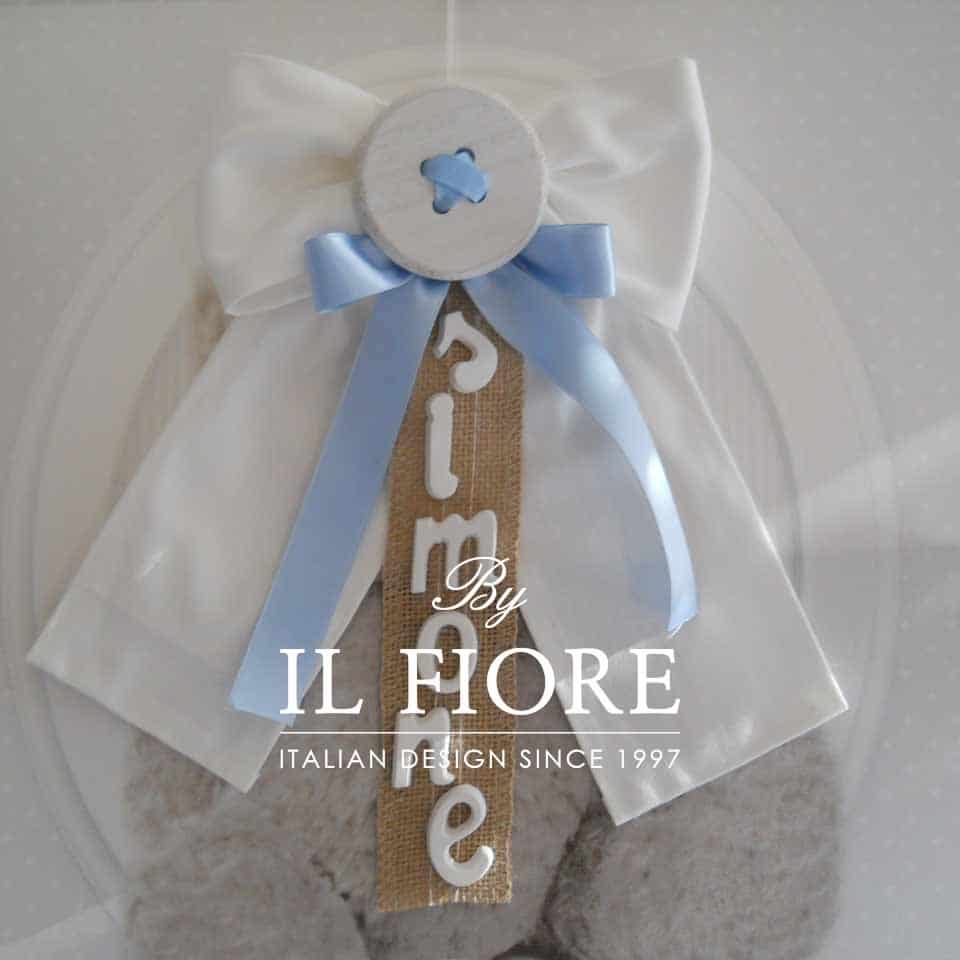 Fiocco nascita bimbo e bimba, in cotone bianco e fiocchi di nastro di raso celeste e al centro del grande fiocco c’è il bottone di legno e fascia in juta da personalizzare con il nome del vostro principino o principessa in gesso profumatissimo. I nostri fiocchi raffinati, nuovi e unici, vi daranno la possibilità di annunciare in modo elegante l’arrivo del vostro bimbo o della vostra bimba. E’ disponibile in rosa e celeste tutto realizzato a mano made in Italy.