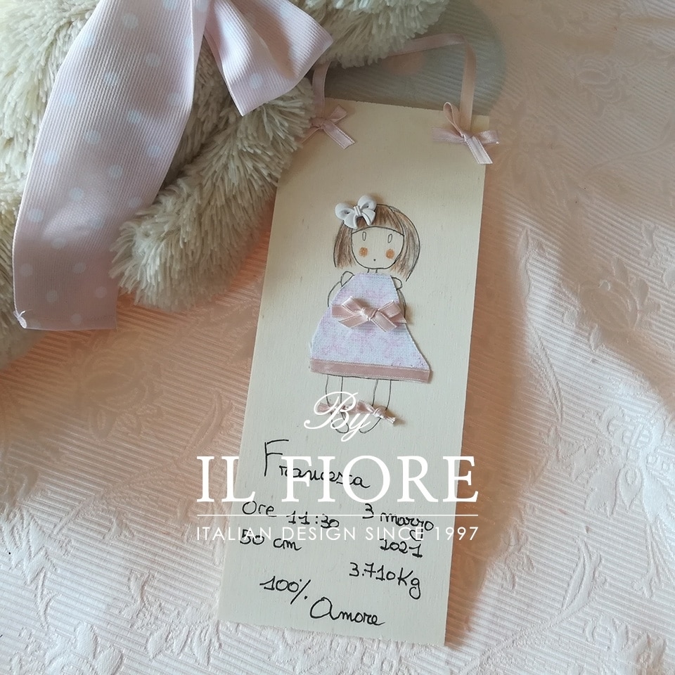 Targa Fuoriporta originalissimo fiocco nascita, rettangolare in legno con bimba disegnata a mano. Da Appendere sulla porta della cameretta o per decorare in modo originale e romantico la stanza o il lettino, tutto interamente fatto a mano. Perfetto come Idea Regalo. Disponibile con confezione regalo. N.B. Solo ed esclusivamente per gli articoli da regalo la spedizione è di € 3,50 per un massimo di acquisto di tre articoli.