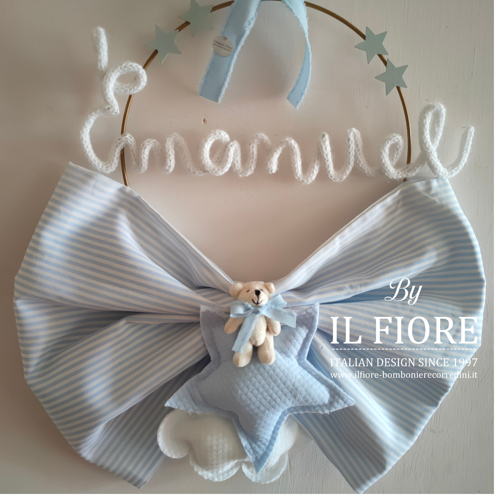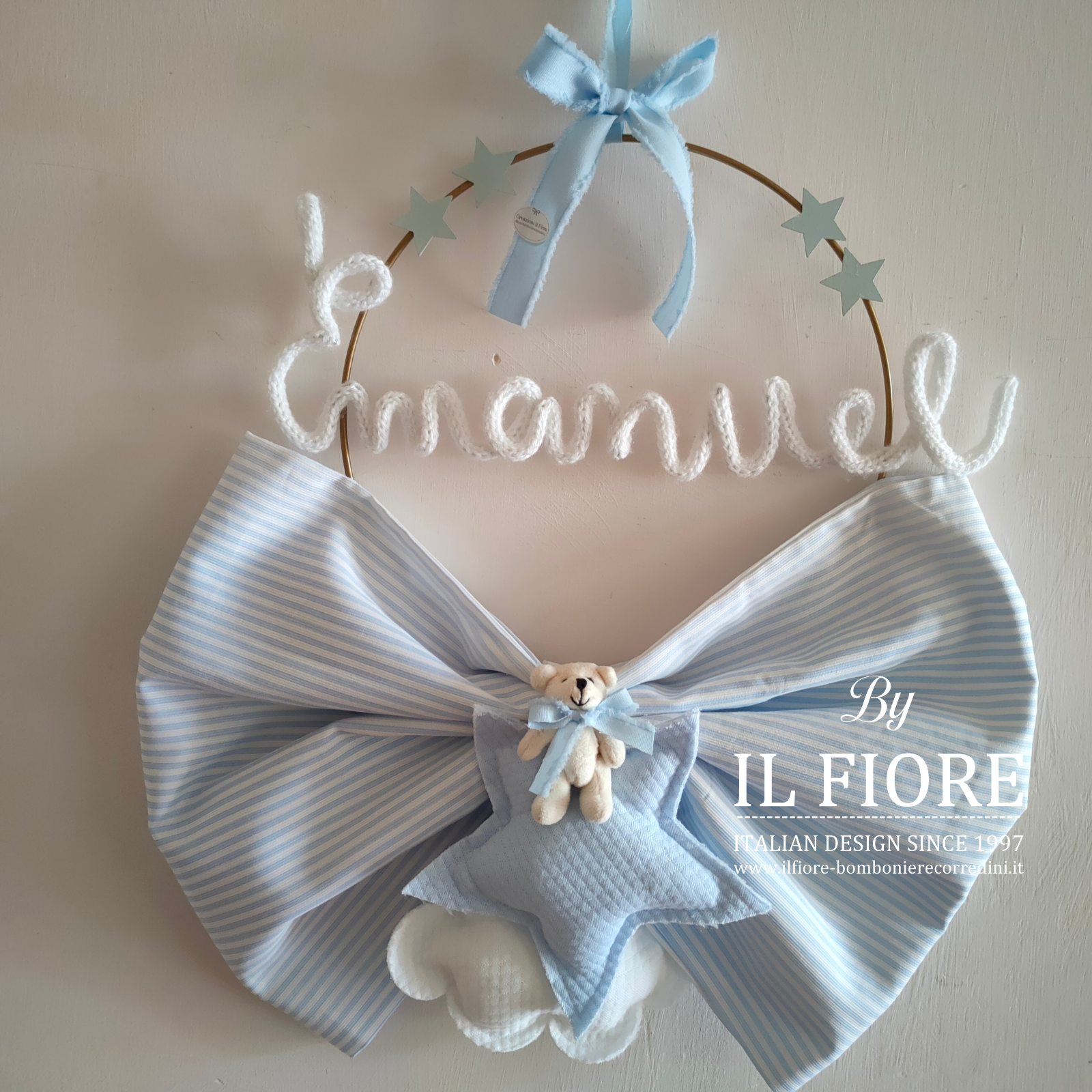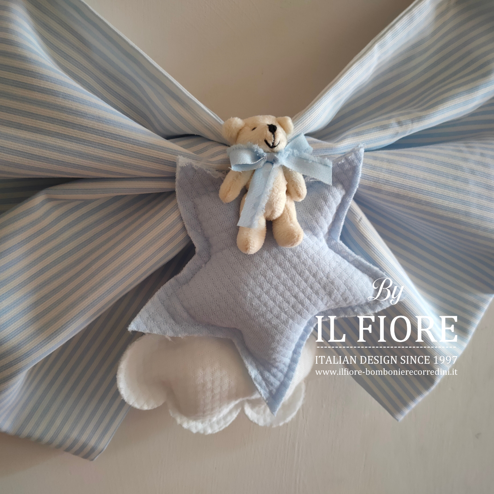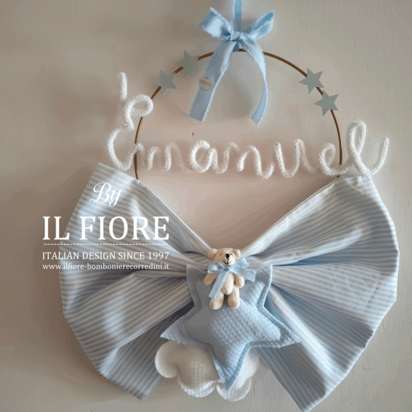 Fiocco nascita personalizzabile decorato con stella nuvoletta e orsetto