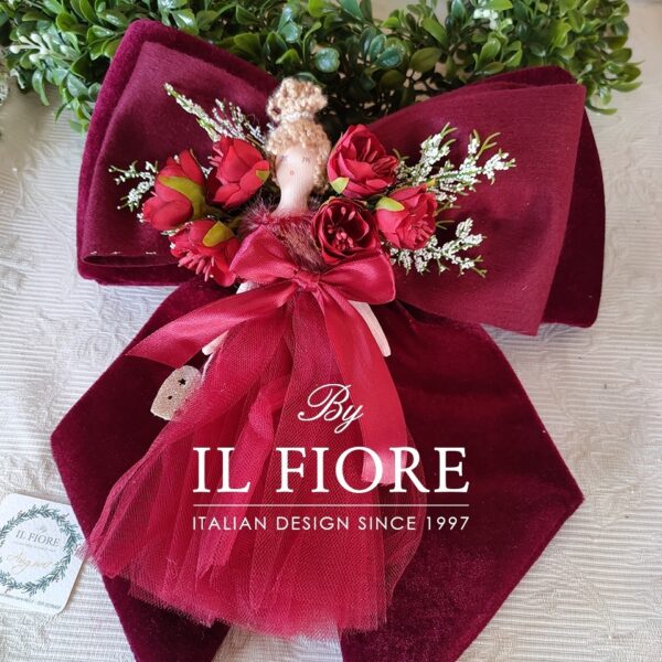 Fiocco natalizio doppio di colore rosso per albero di Natale in velluto interamente fatta mano con bambola fatina e fiori. Splendido ed originale regalo di Natale fatto con il cuore.
