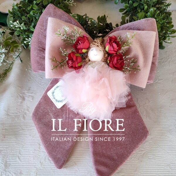 Fiocco natalizio doppio di colore rosa per albero di Natale in velluto interamente fatta mano con bambola e fiori. Splendido ed originale regalo di Natale fatto con il cuore.