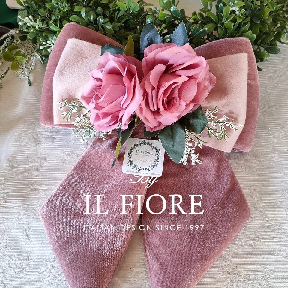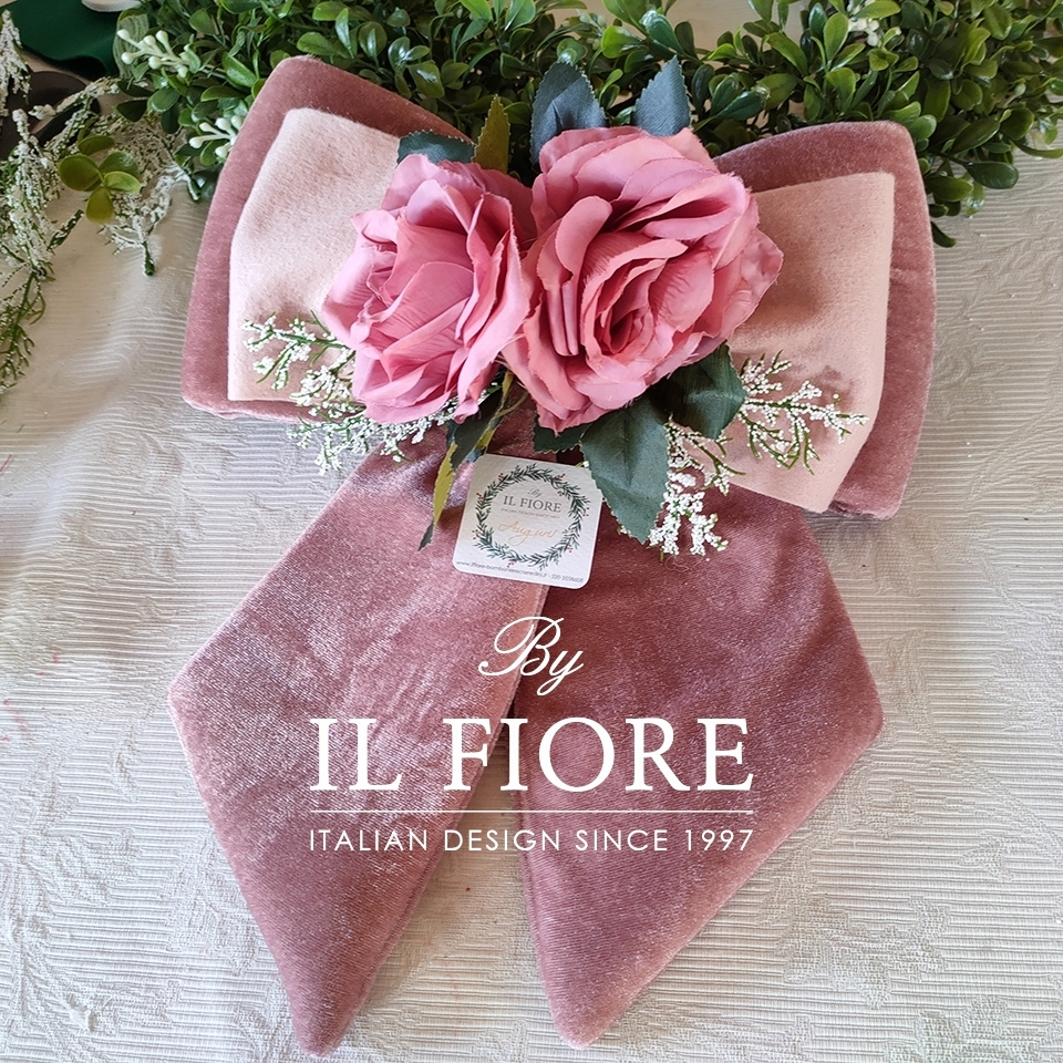 Fiocco natalizio doppio di colore rosa in velluto per albero di Natale interamente fatta mano con fiori. Splendido ed originale regalo di Natale fatto con il cuore.