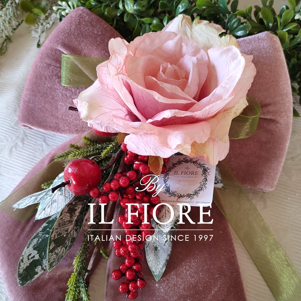 Fiocco natalizio rosa per albero di Natale in velluto interamente fatta mano con fiori. Splendido ed originale regalo di Natale fatto con il cuore.