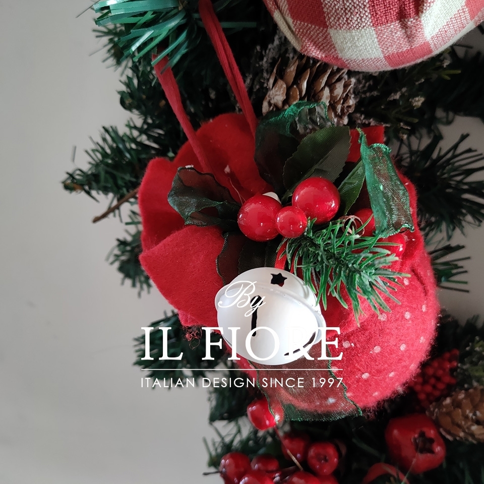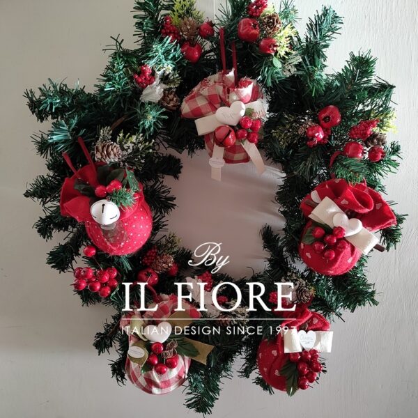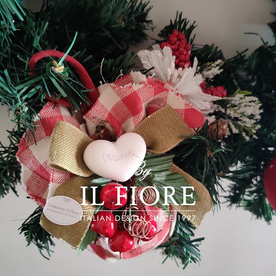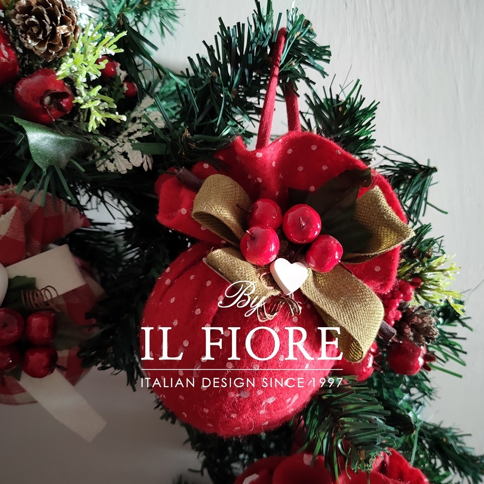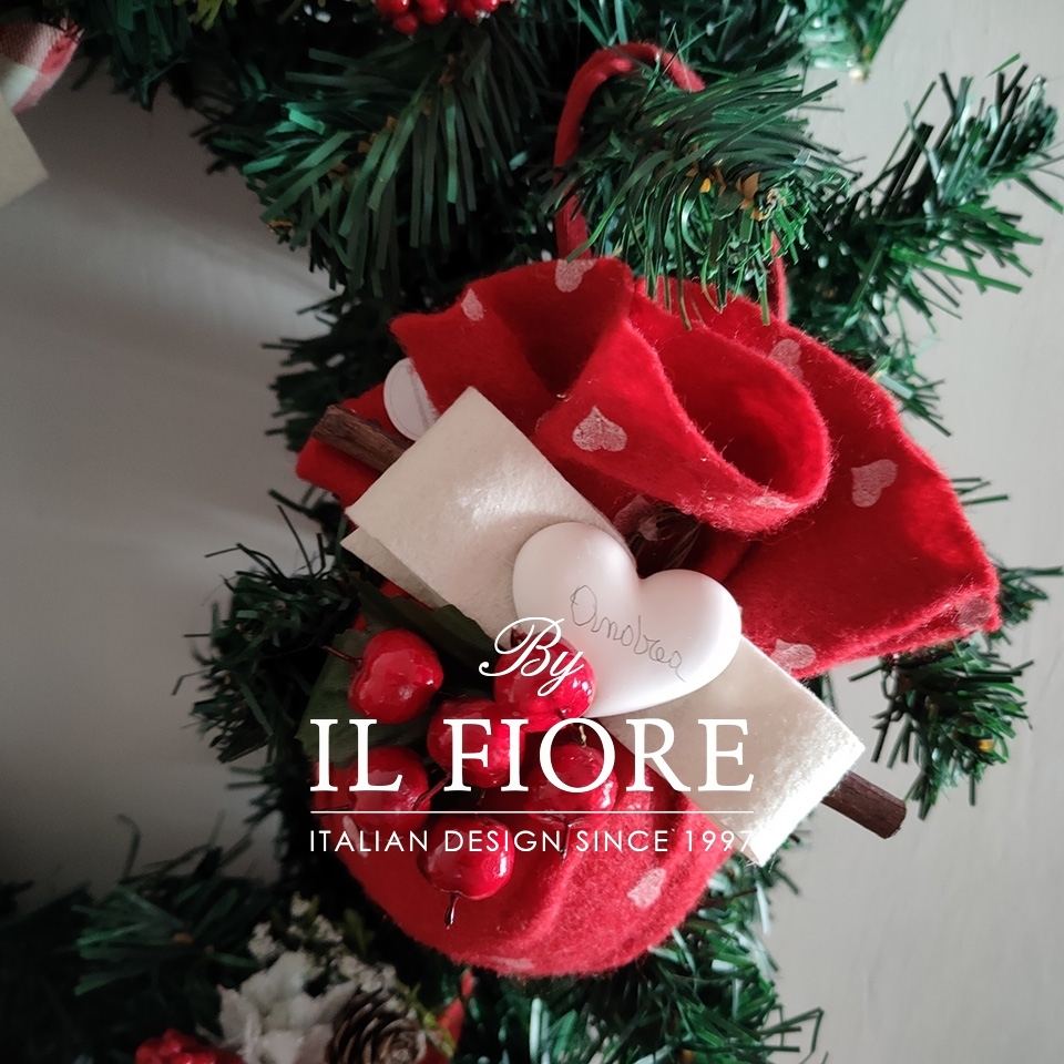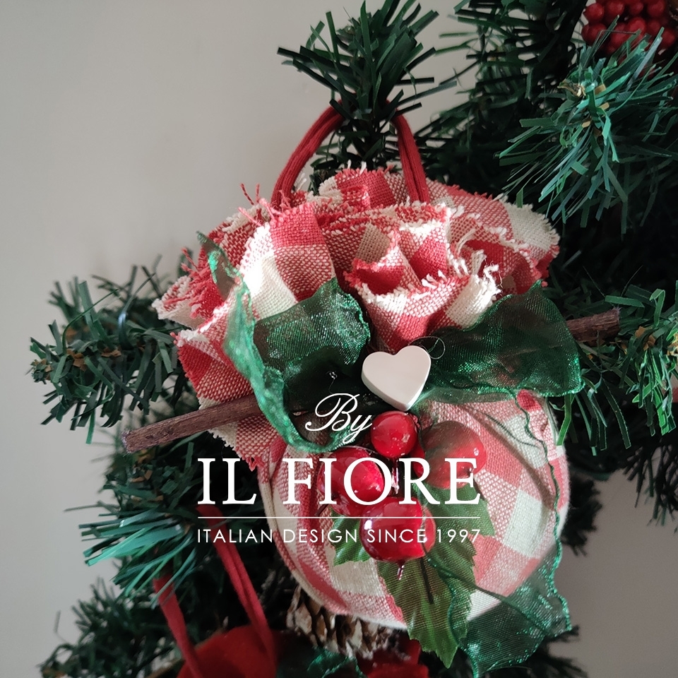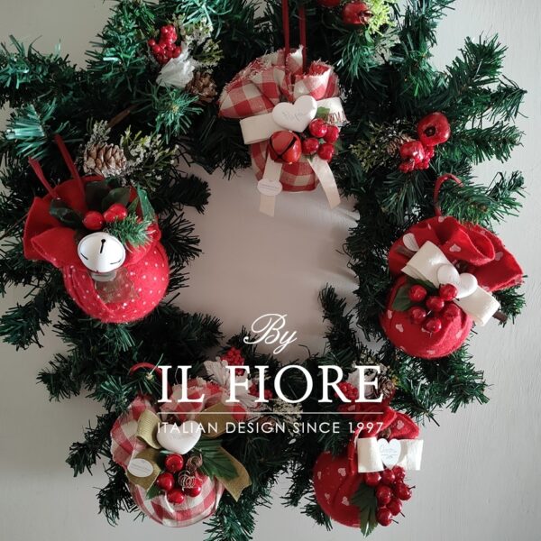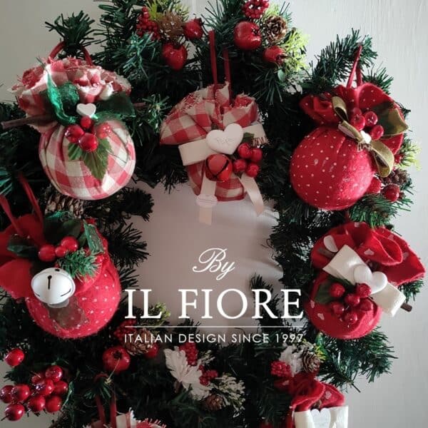 Ghirlanda natalizia grande con palline rivestite e decorate a mano e bacche. I cuori in gesso si possono personalizzare con scritta mamma, papà e nomi.