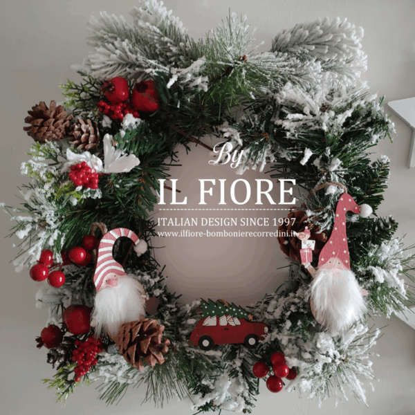 Ghirlanda natalizia con gnomi e macchinina.