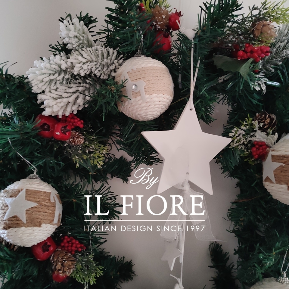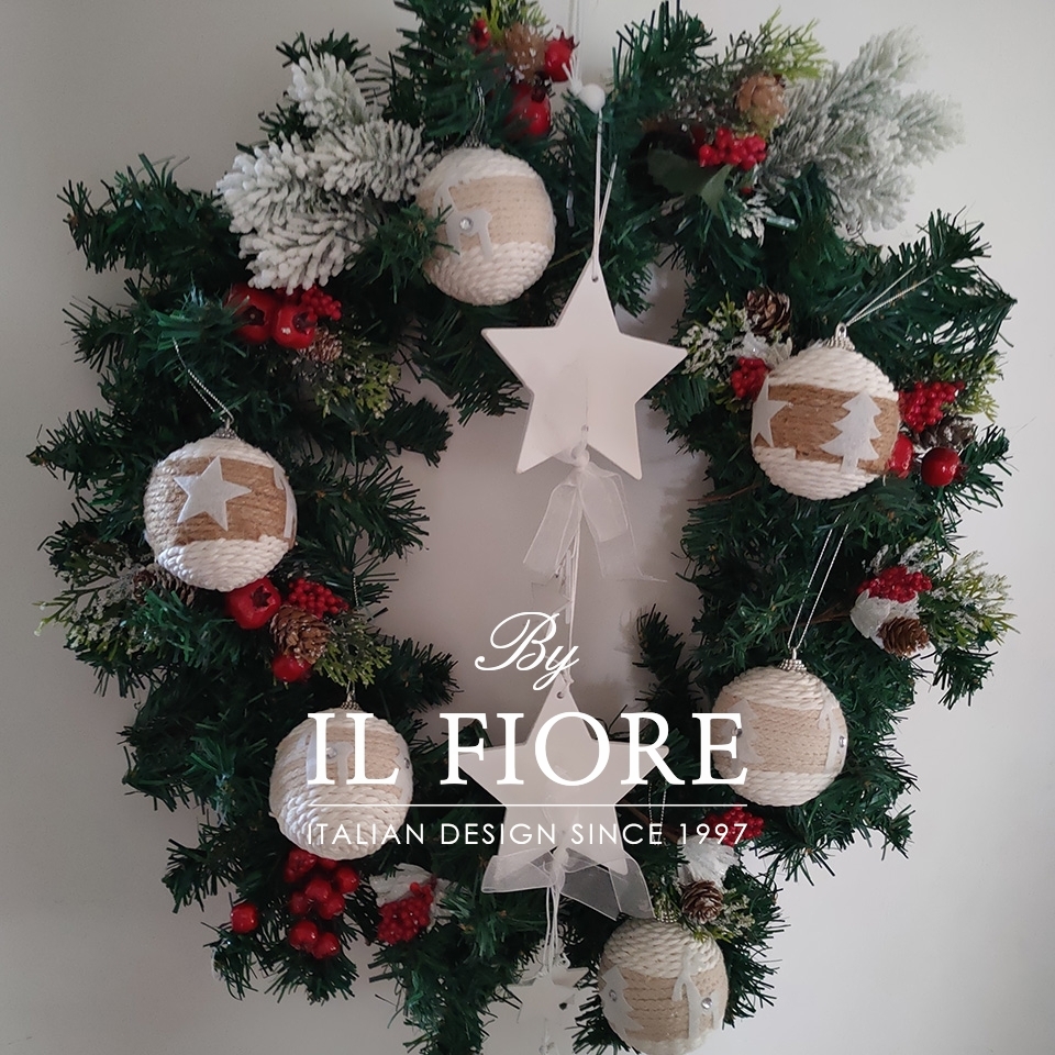 Ghirlanda natalizia con stelle e palline decorate. Arricchita nella parte centrale con stelle bianche in legno.