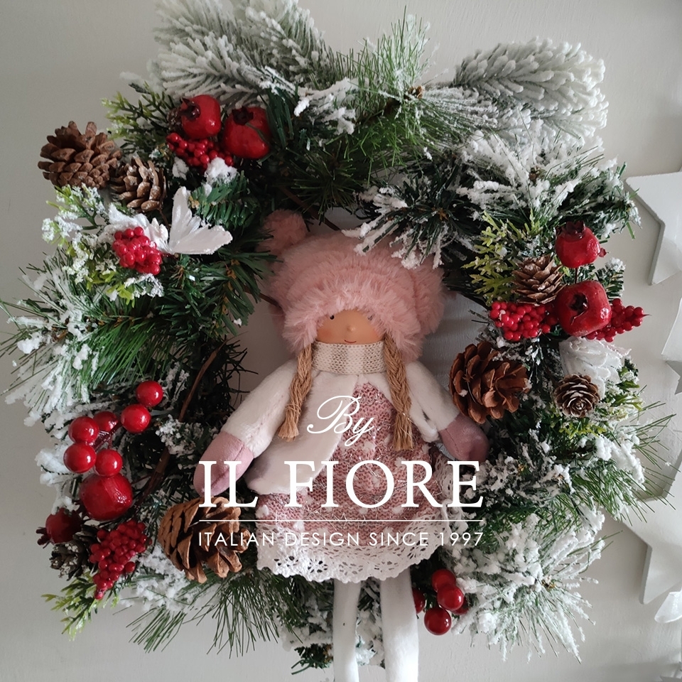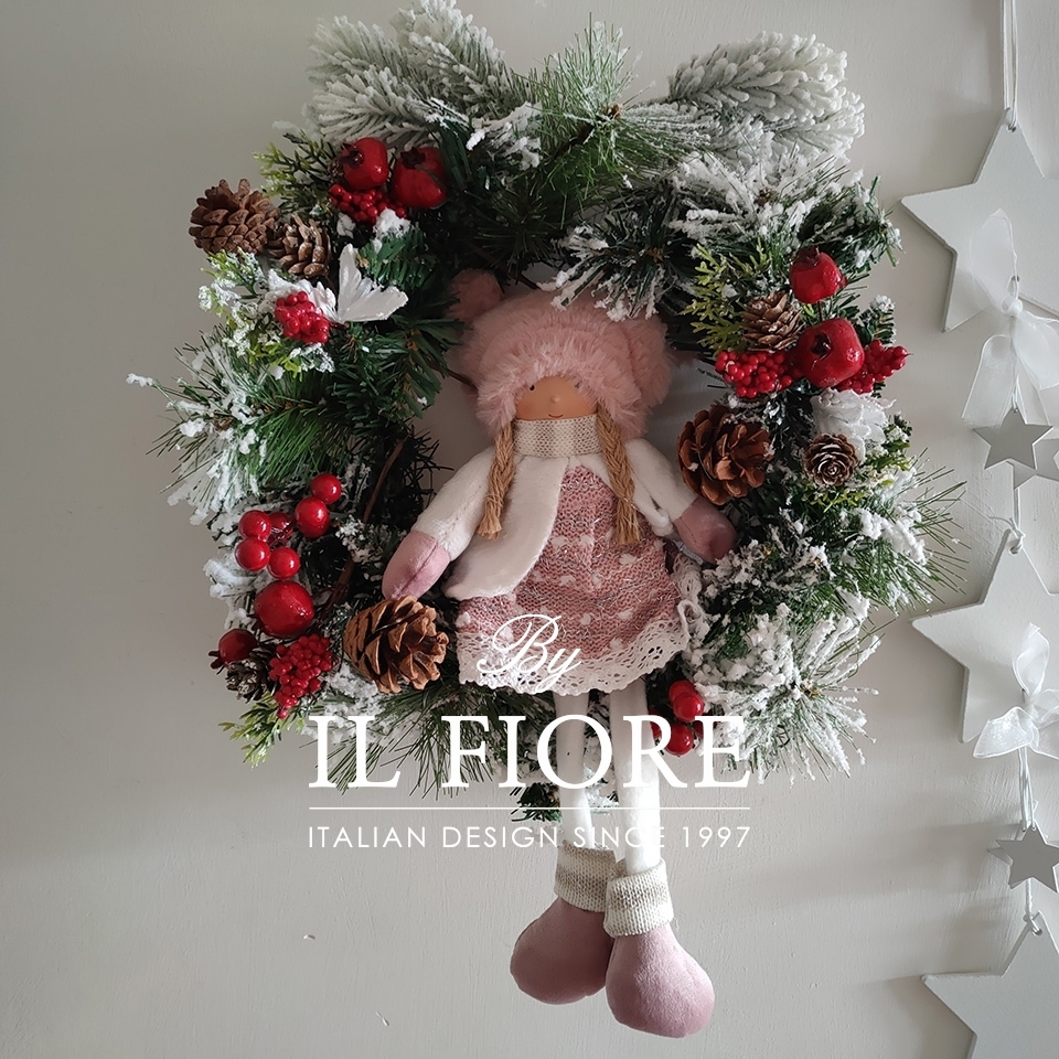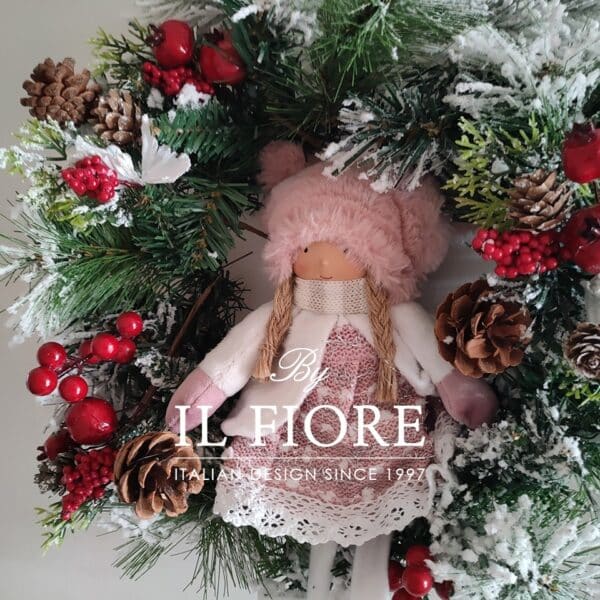 Ghirlanda natalizia in pino con bacche, arricchita nella parte centrale con bambola in pezza.
