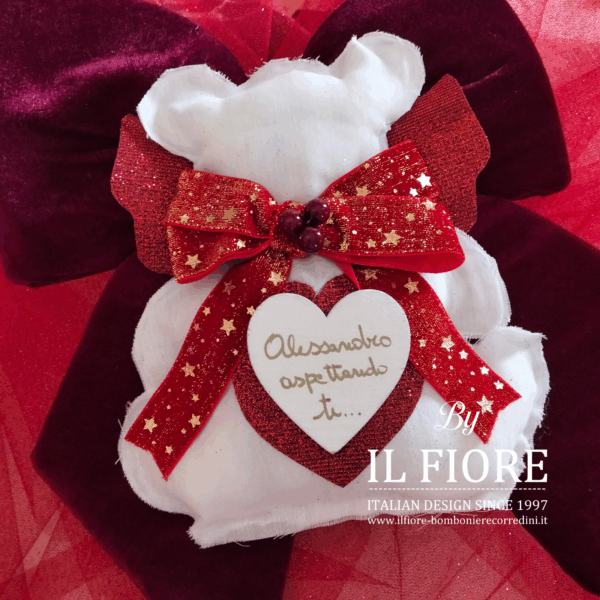 Decorazione natalizia per albero di Natale orsetto personalizzabile con nome ASPETTANDO TE… per bimbo e bimba. Originale addobbo natalizio e articolo da regalo. Compresa nel prezzo confezione regalo.