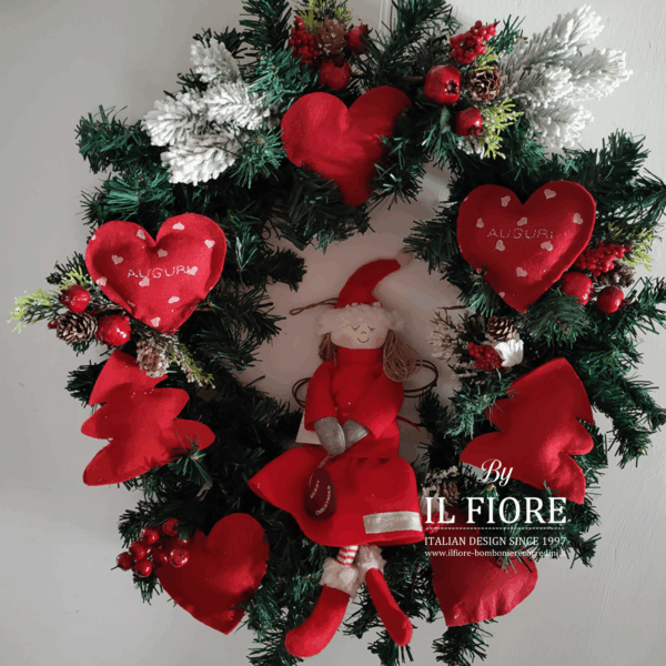 Ghirlanda natalizia con cuoricini e bacche, arricchita nella parte centrale con uno splendido angelo di pezza.