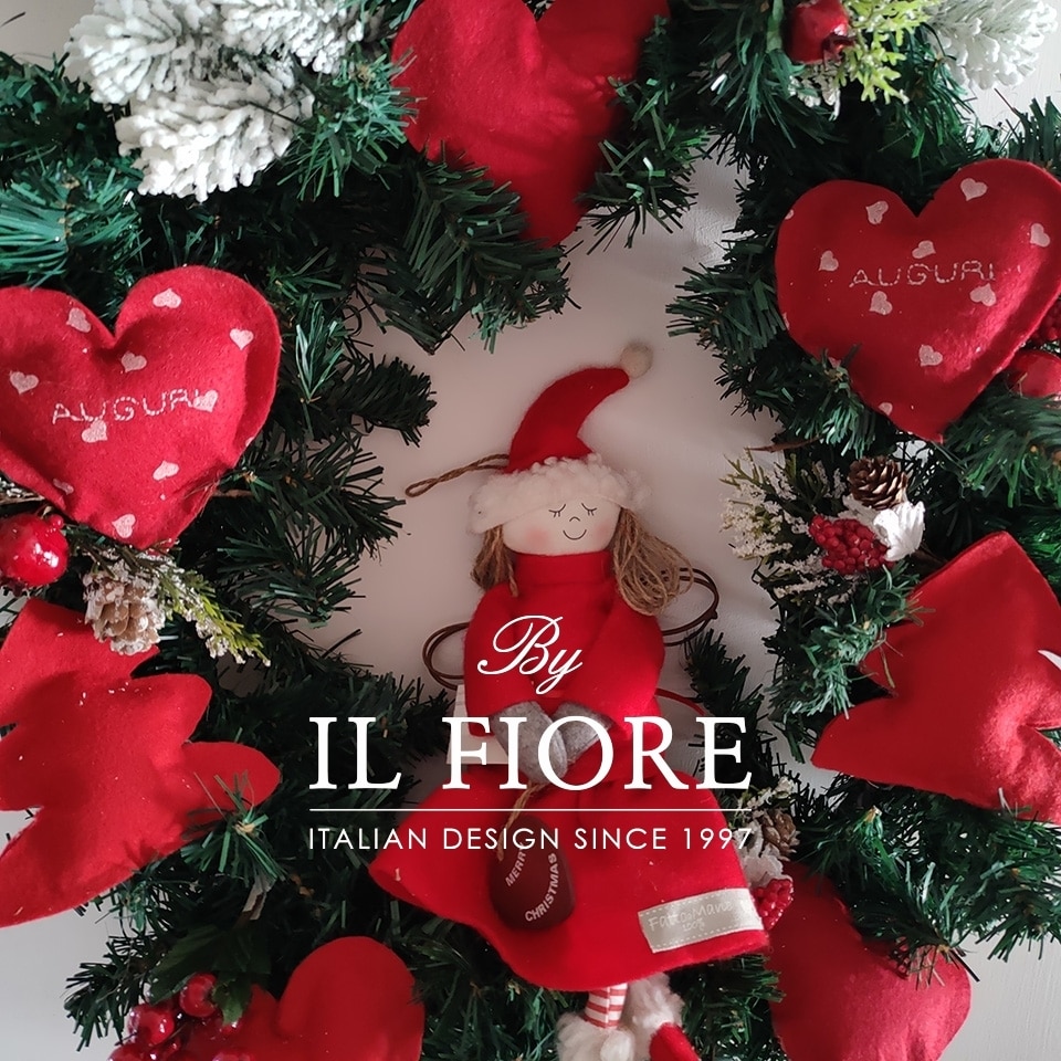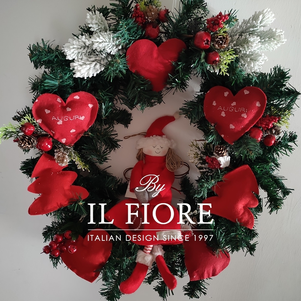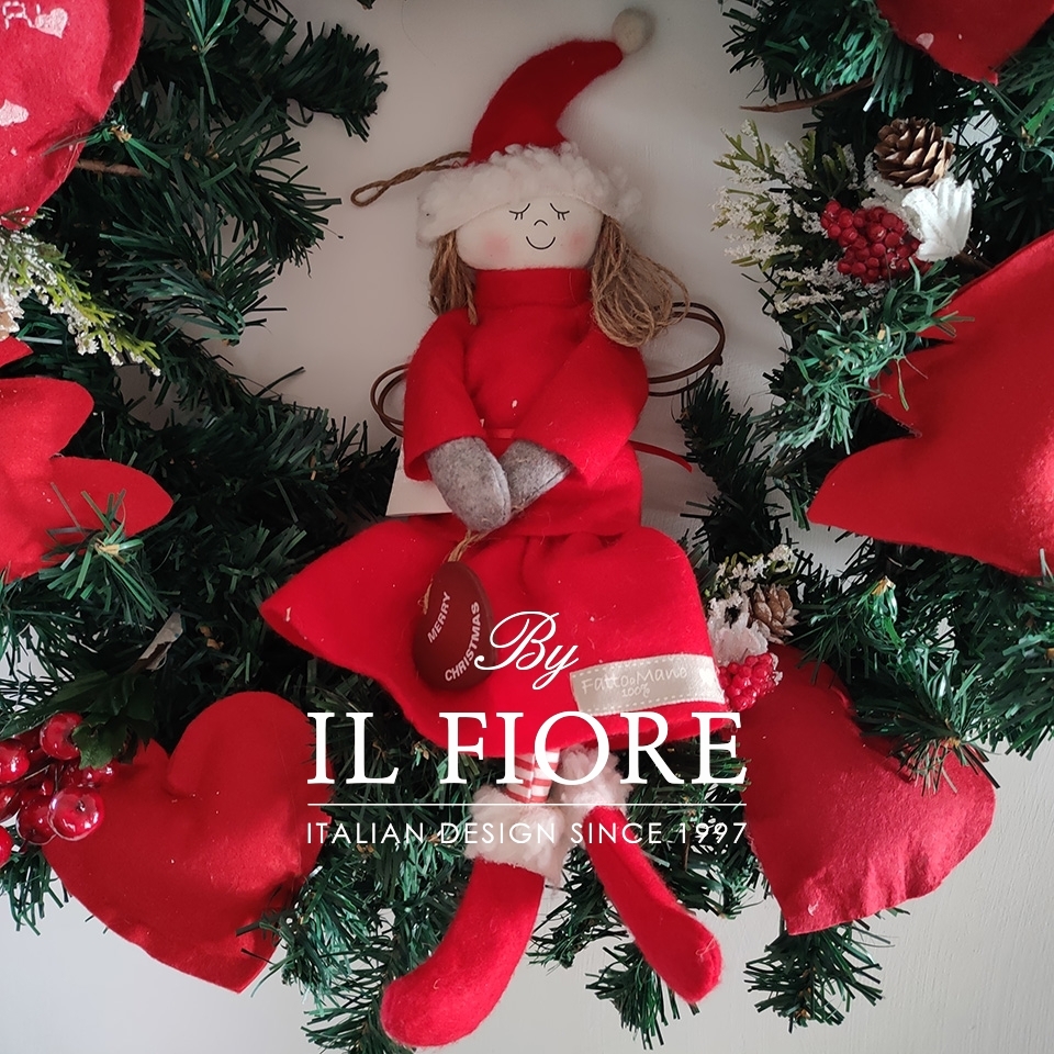 Ghirlanda natalizia grande con cuori e alberi fatti a mano in pannolenci. La parte centrale è arricchita da un dolcissimo angelo in pezza.