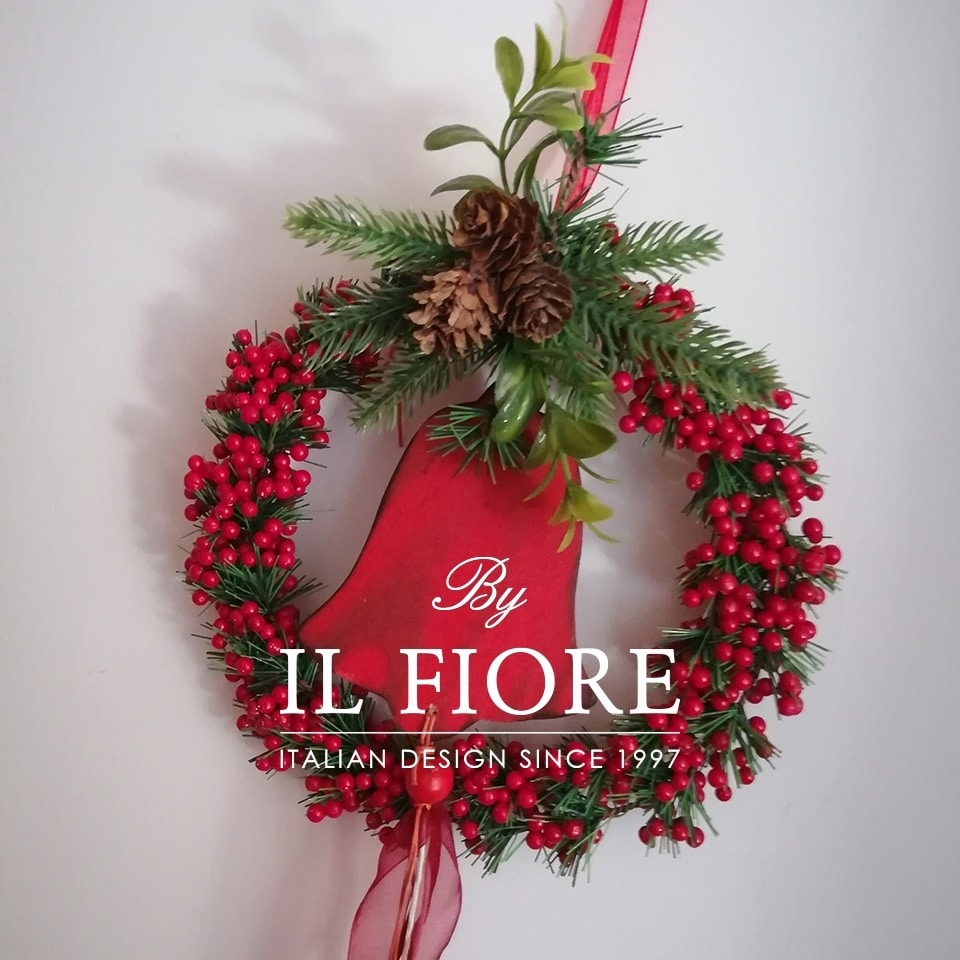 Decorazione centrale con campana in legno dipinto di rosso e nastri in organza realizzata a mano.