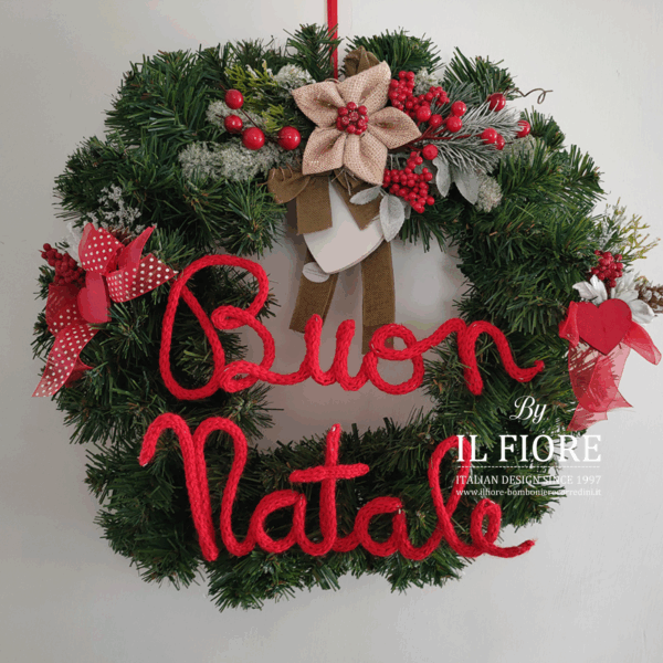 Ghirlanda natalizia con bacche e arricchita nella parte centrale con la scritta Buon Natale.
