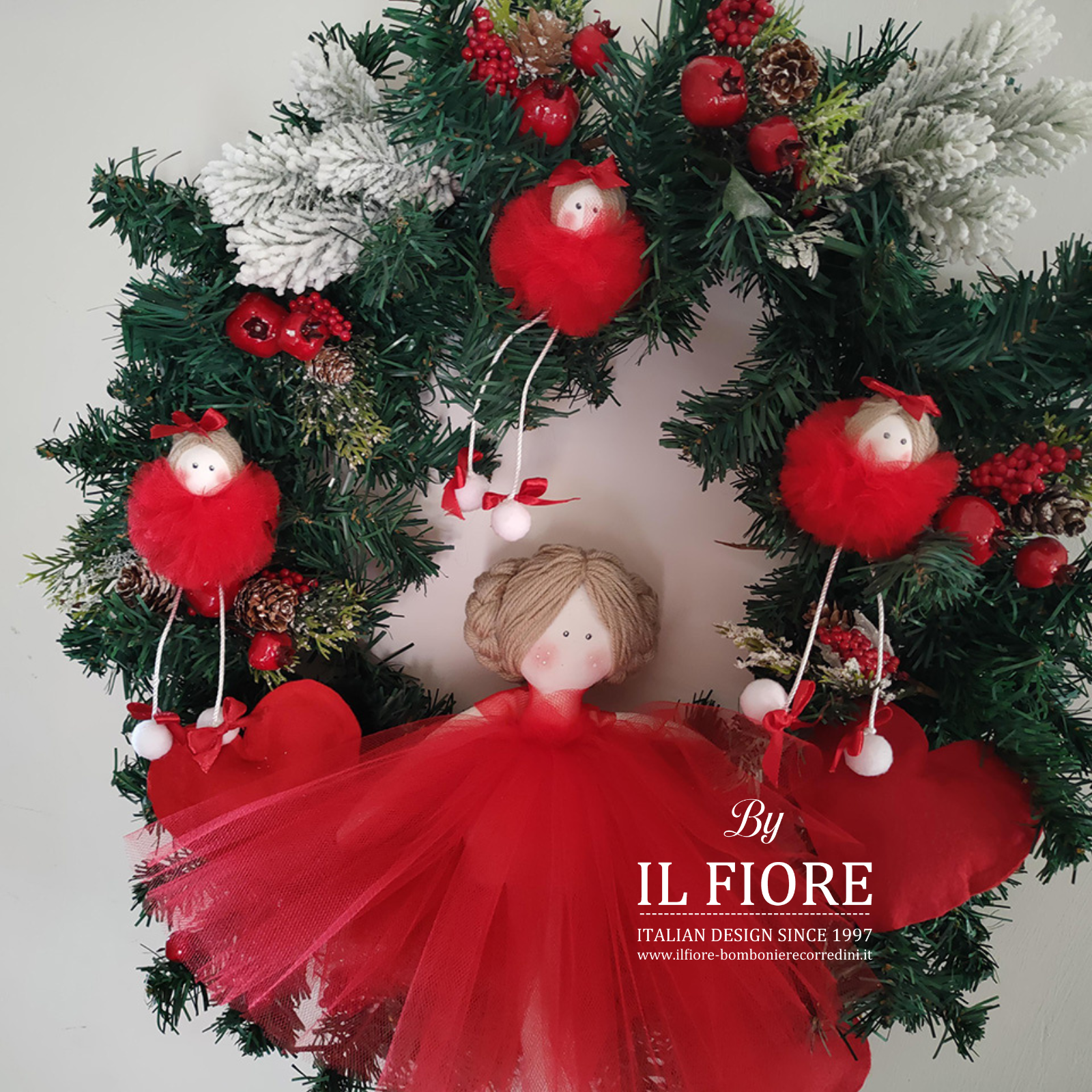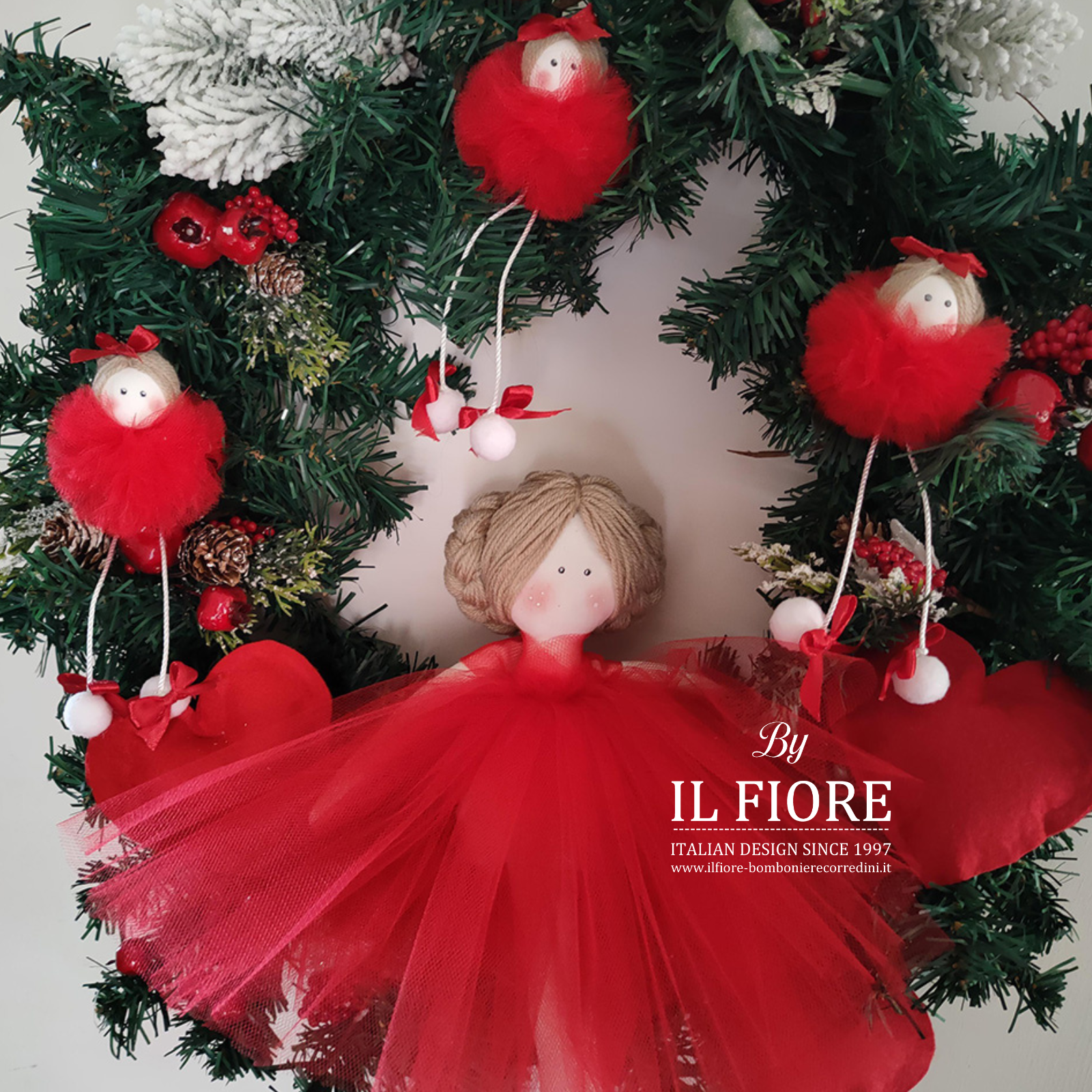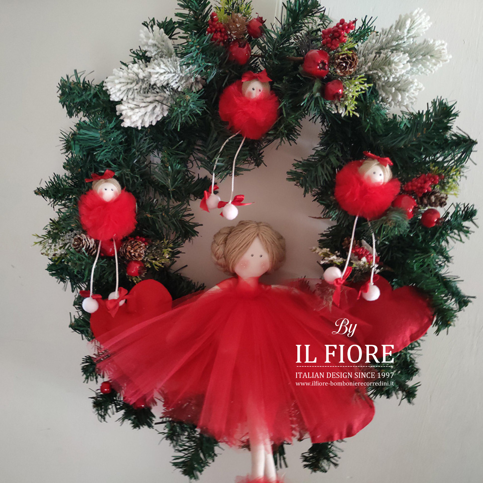 Ghirlanda natalizia con bambola e bamboline con vestito in tulle. Arricchita nella parte centrale con una splendida bambola in pezza con vestito rosso in tulle.