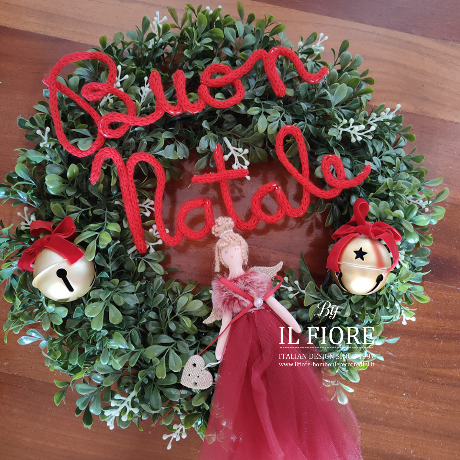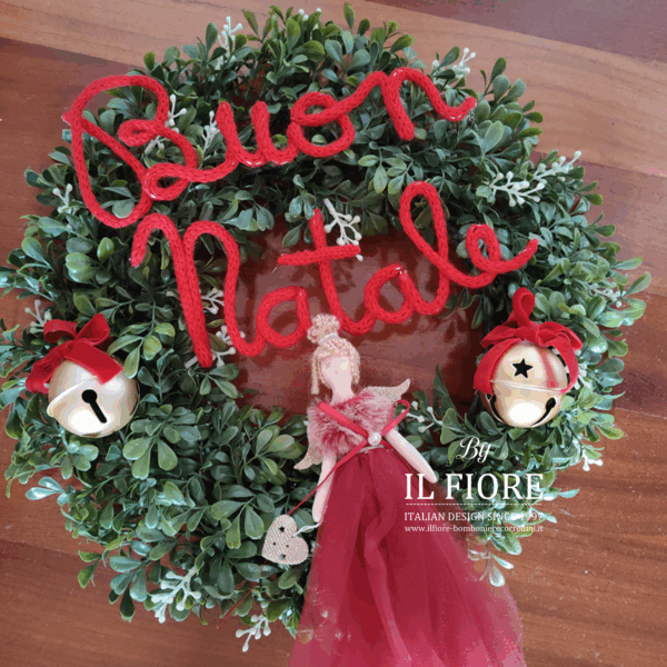 Ghirlanda natalizia con bambola vestito in tulle e campanelle. Arricchita nella parte centrale con una splendida bambola in pezza con vestito rosso in tulle.