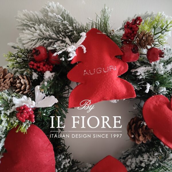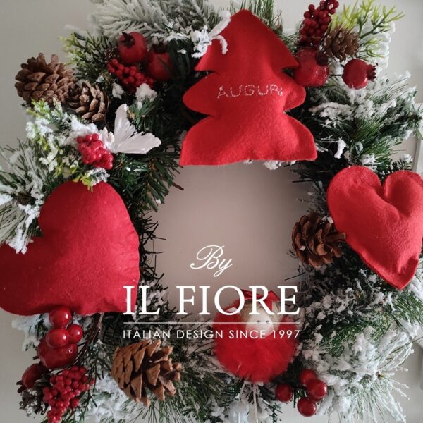 Ghirlanda natalizia con bambolina in tulle rosso, cuori e albero di Natale realizzati a mano in pannolenci e bacche.