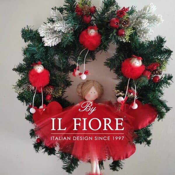 Ghirlanda natalizia  con bamboline in tulle rosso e bacche. Arricchita nella parte centrale con una splendida bambola in pezza con vestito rosso in tulle.