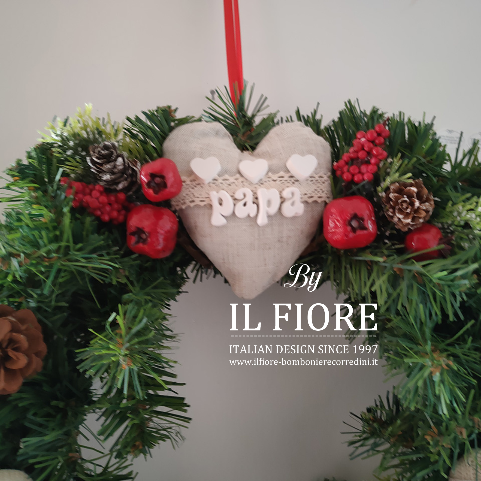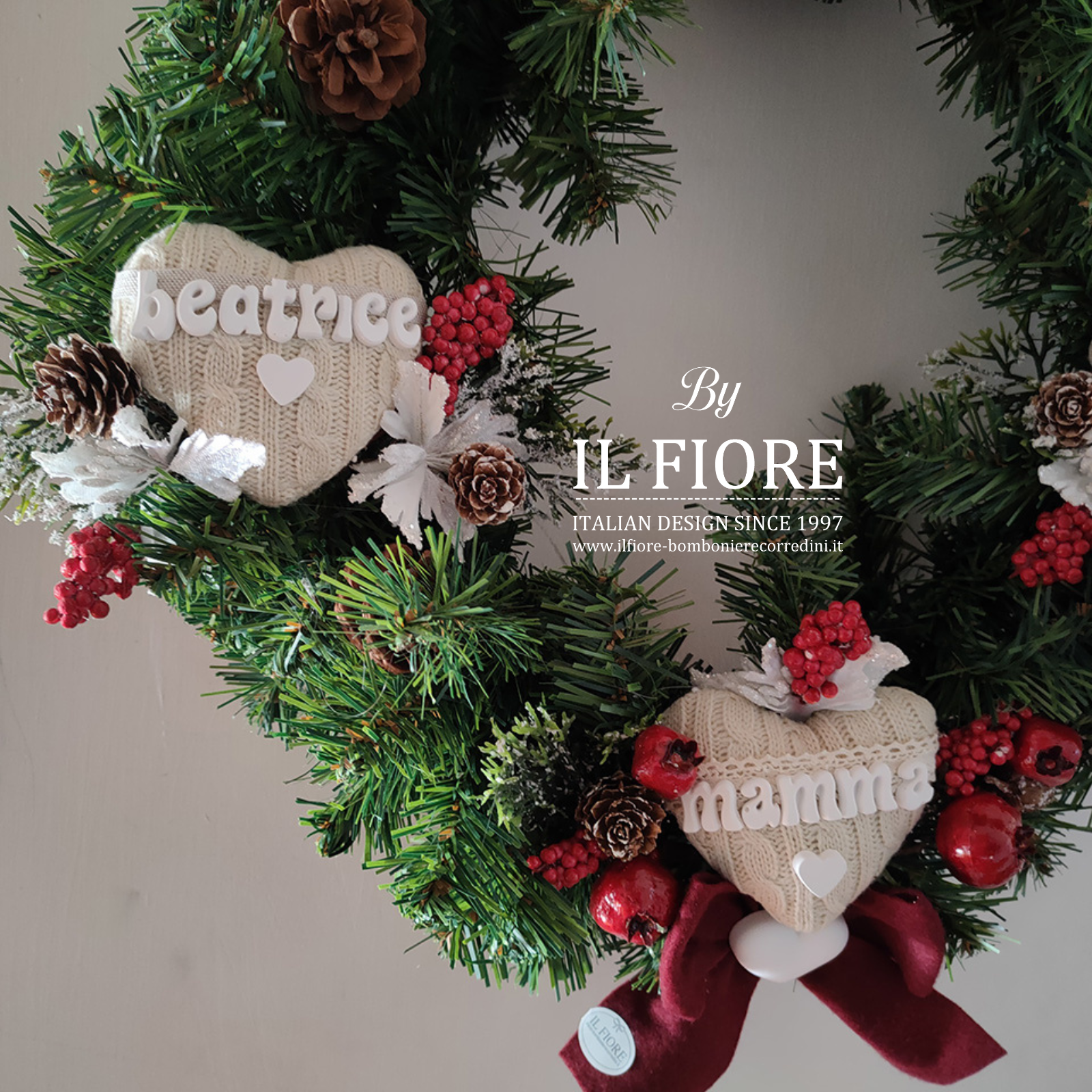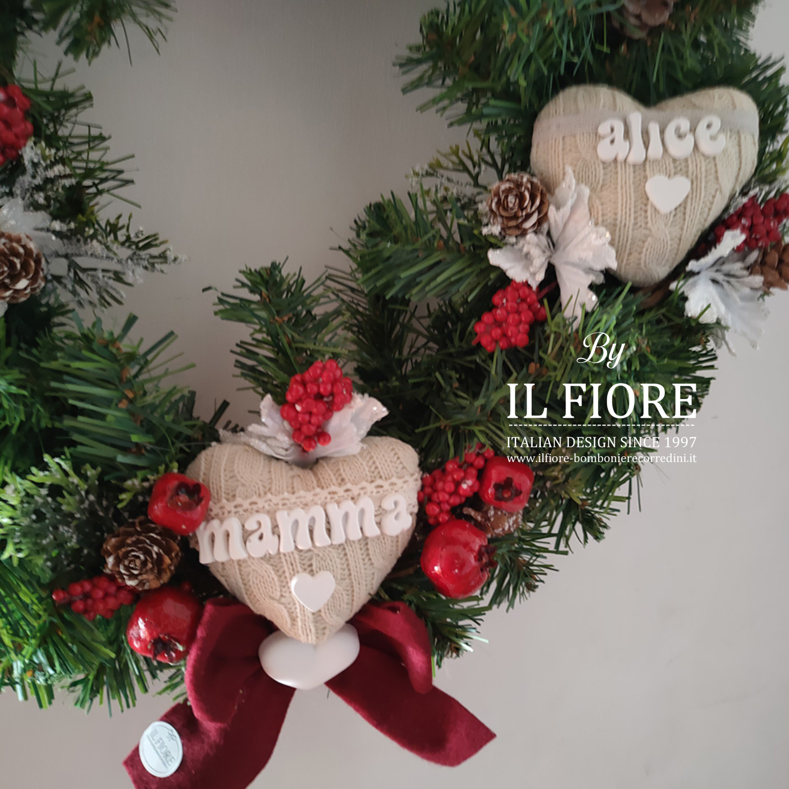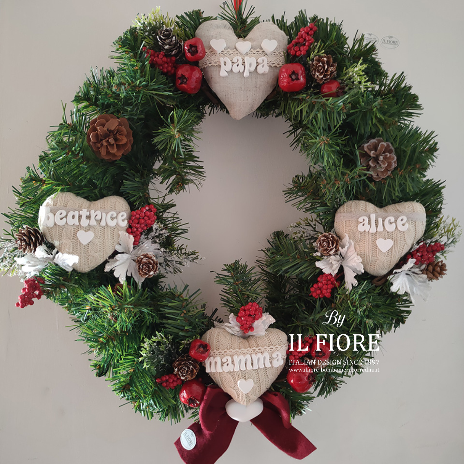 Ghirlanda natalizia con cuori personalizzabili con nomi e bacche.