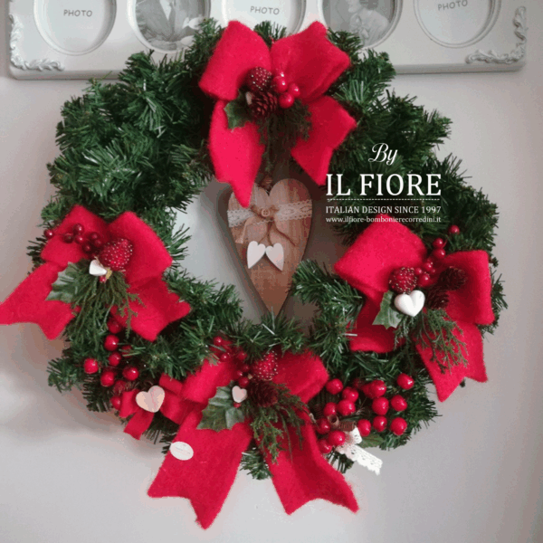 Ghirlanda natalizia con cuore, fiocchi rossi e bacche.