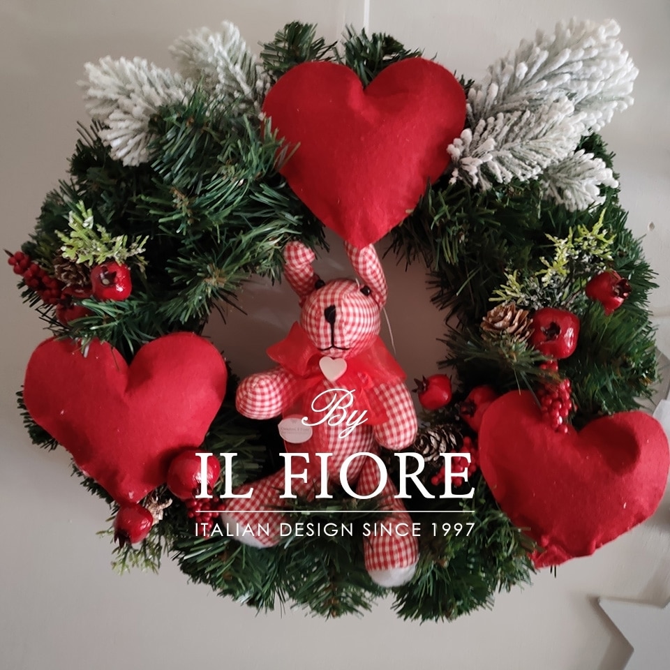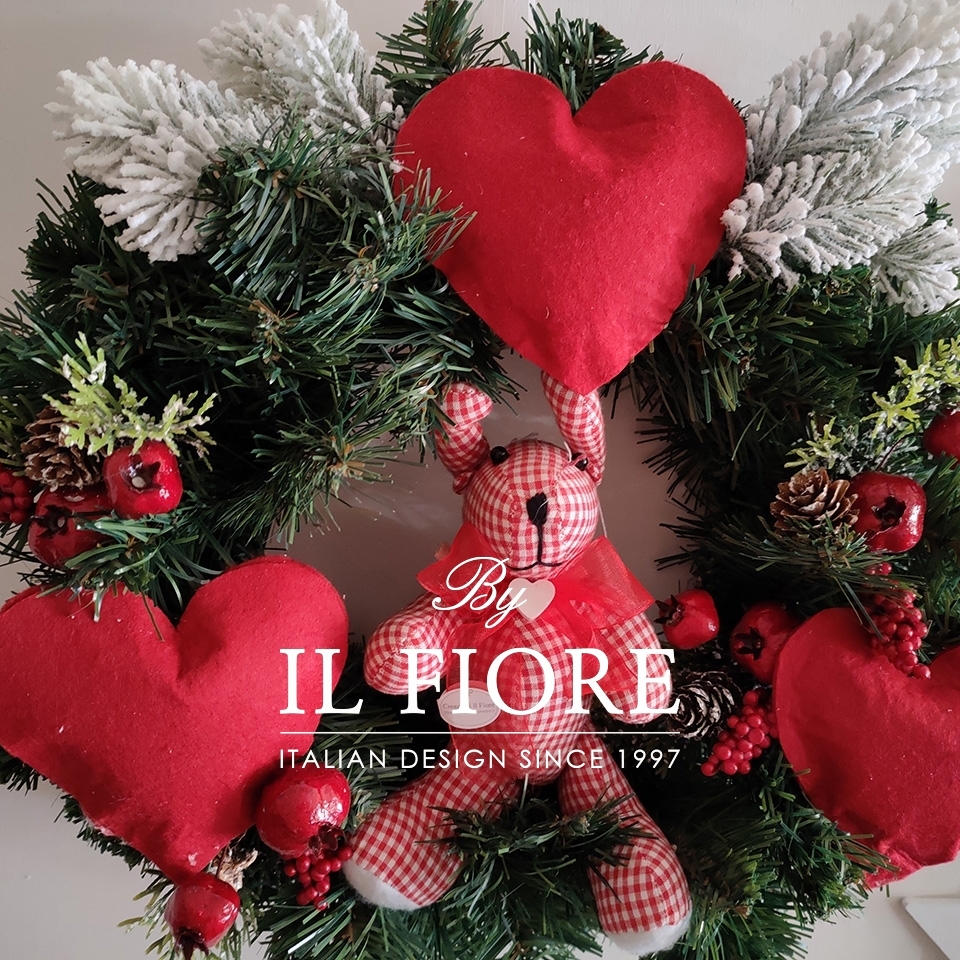 Ghirlanda natalizia con cuori rossi e bacche. Arricchita nella parte centrale con renna in pezza a quadretti rosso.