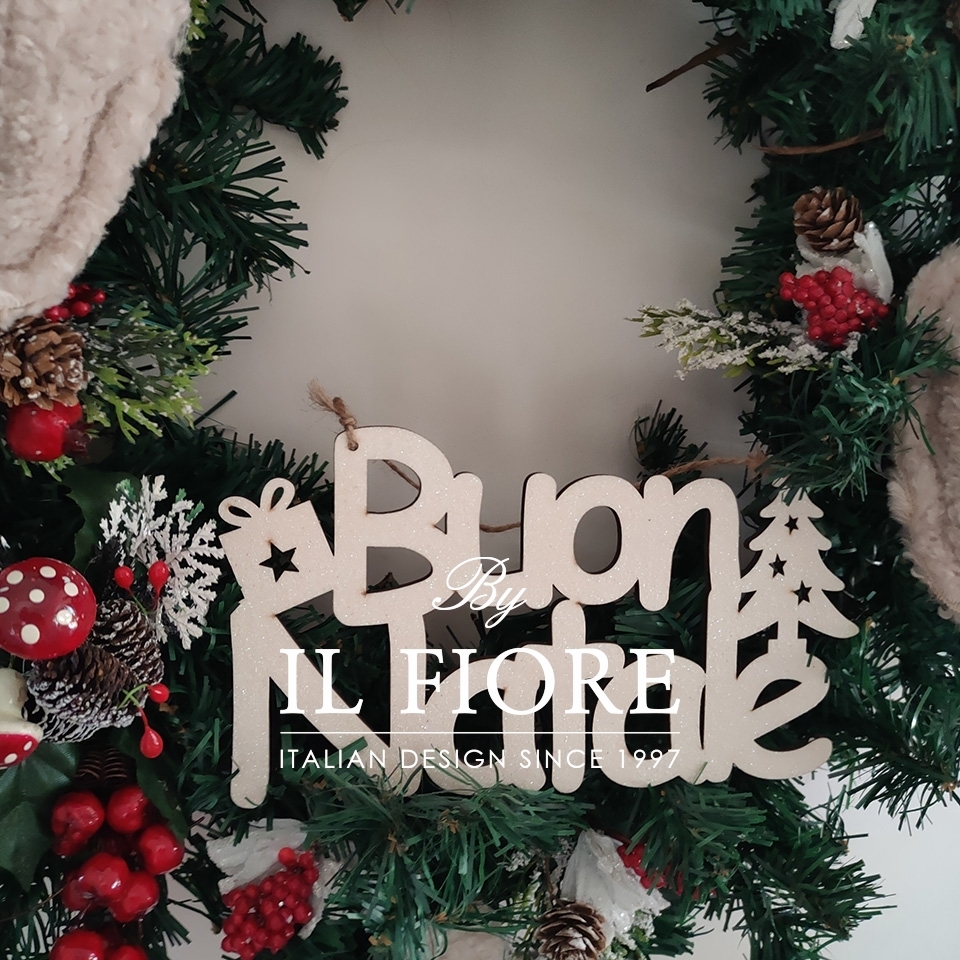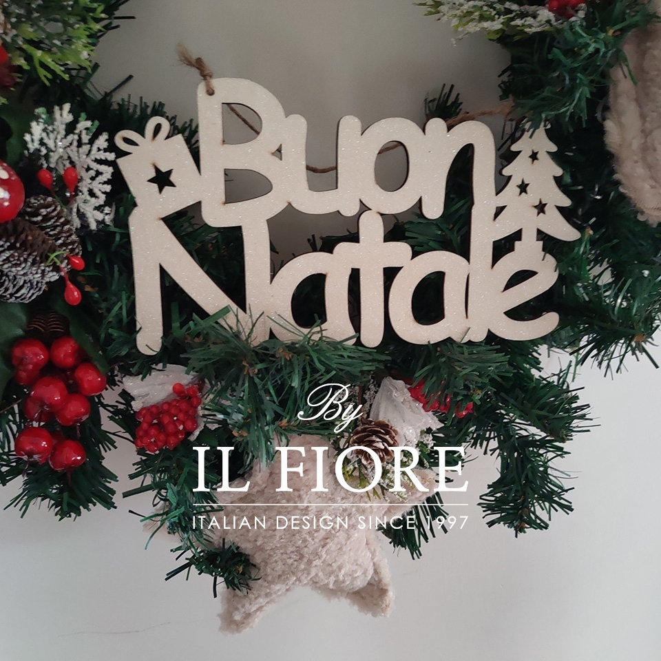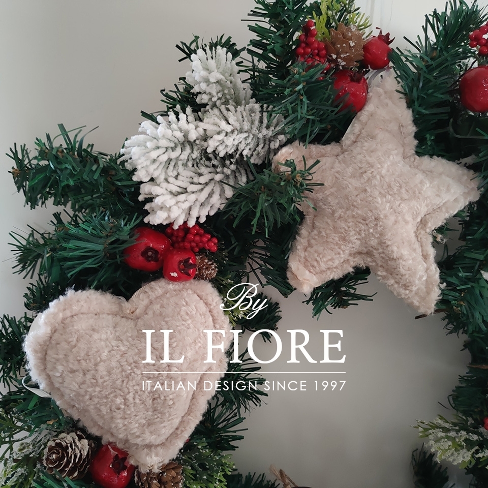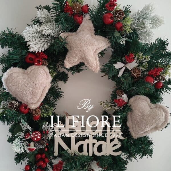 Ghirlanda natalizia in pino con cuore, stella peluche e bacche. Arricchita nella parte centrale dalla scritta Buon Natale in legno.