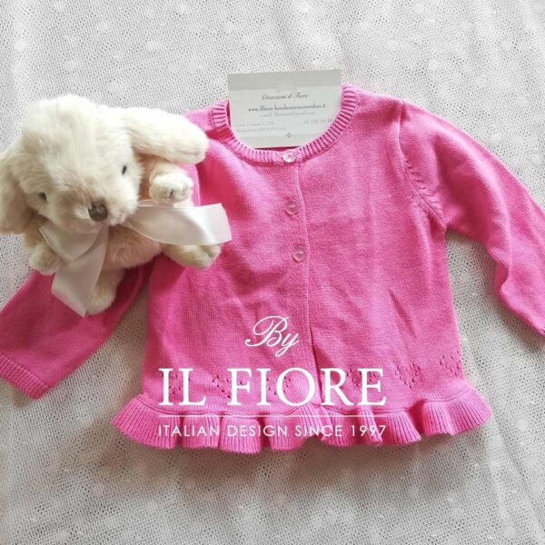 Giacchina per bambina di colore fucsia, realizzata in cotone 100%, maniche lunghe, chiusa sul davanti con due bottoni. Sono disponibili le taglie, una 1/3 e una 3/6 mesi selezionare sotto la taglia desiderata. Prezzo scontato da € 33,00 a € 15,50. Sono disponibili gli ultimi due pezzi. Made in Italy.