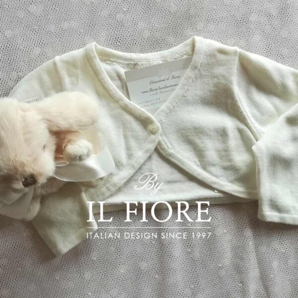 Giacchina per bambina di colore panna, realizzata in cotone 100%, maniche lunghe, chiusa sul davanti con un bottone. Sono disponibili le taglie, tre 3/6 mesi e due 6/9 selezionare sotto la taglia desiderata. Prezzo scontato da € 32,00 a € 13,50. Sono disponibili gli ultimi 5 pezzi. Made in Italy.