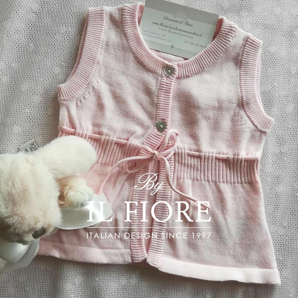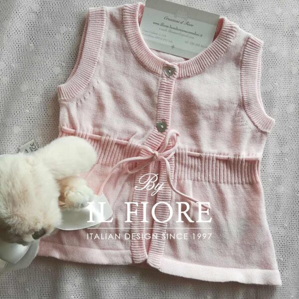 Maglioncino gilet bambina, realizzato in cotone 80% viscosa 20% di colore rosa con maniche corte decorate. Made in Italy. Unica misura 3/6mesi. Prezzo scontato da € 26,00 a € 13,50. Ultimo pezzo.
