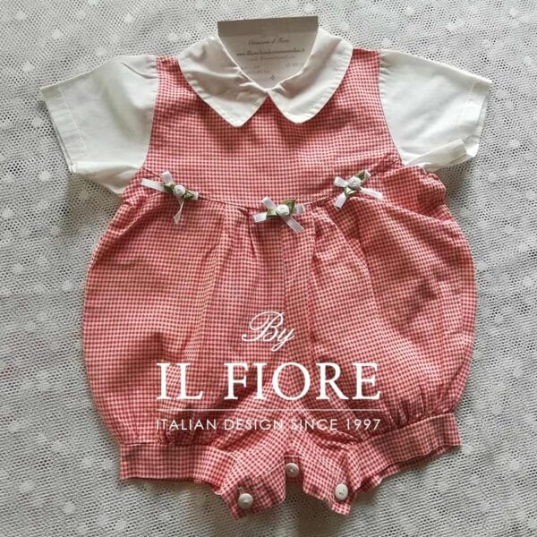 Pagliaccetto per neonata è un prodotto realizzato in puro cotone a quadretti rosso e bianco, maniche corte,  decorato sul punto vita da fiori di raso bianco. La chiusura è sul dietro con bottoni e asole, che sul cavallo dei pantaloni con bottoni.