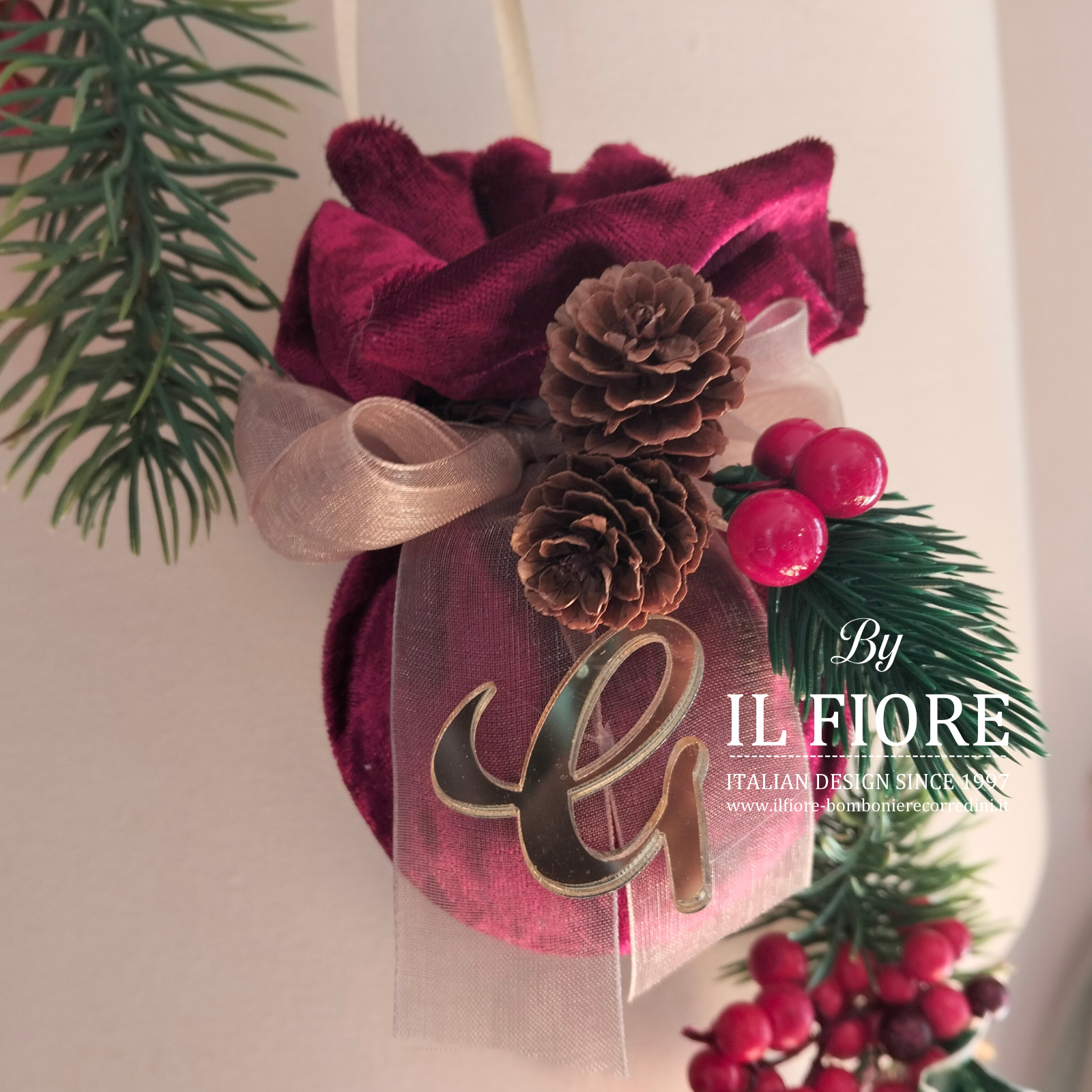Palline Natalizie rivestite con velluto decorata con lettera oro personalizzata e pigne. Sarà un regalo molto apprezzato perchè realizzato a mano. Compresa nel prezzo confezione regalo.