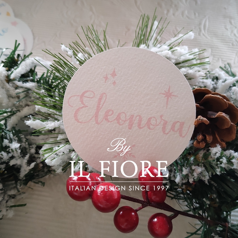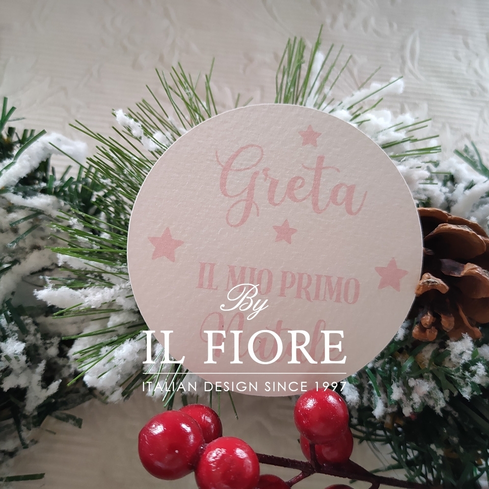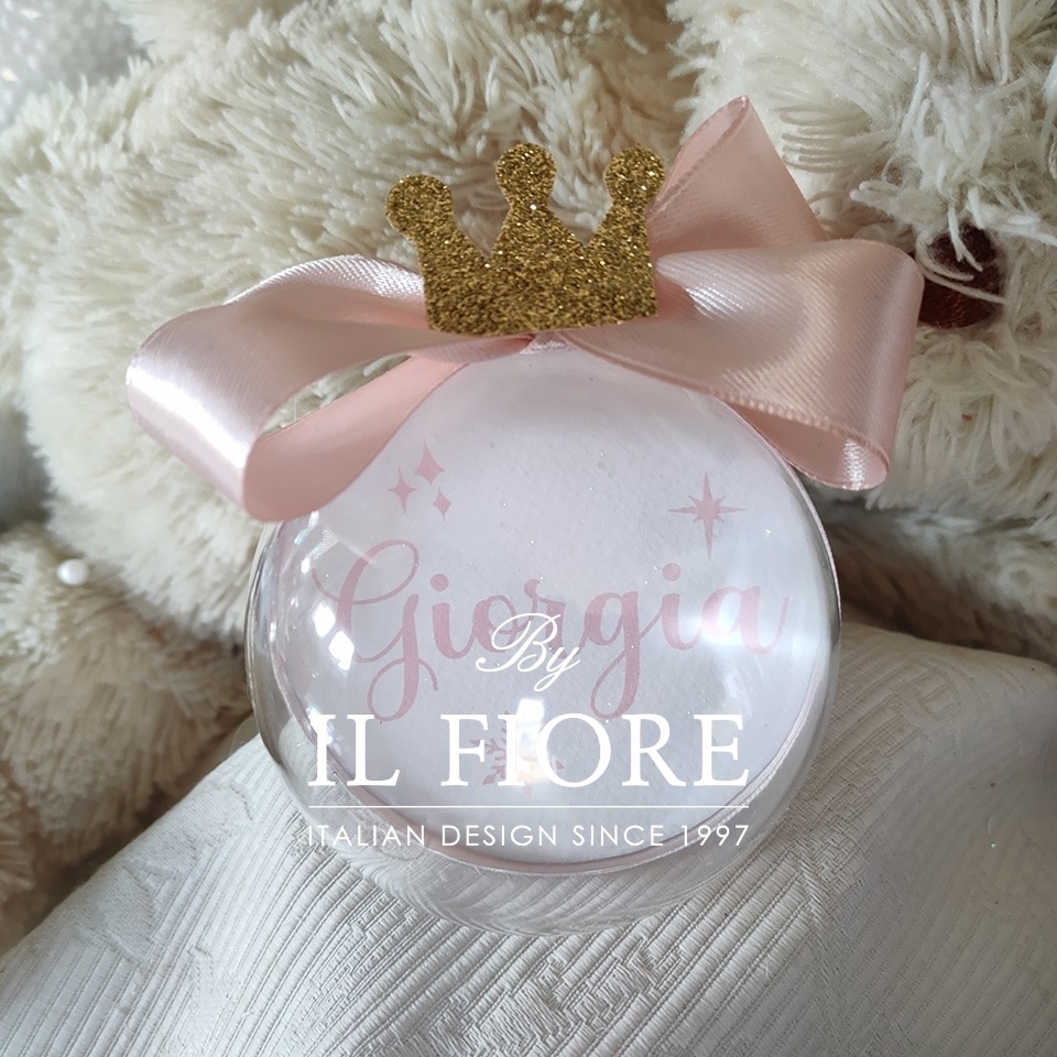 Palline di Natale personalizzabili con nome e decorate con coroncina. La Tag può essere sostituite con la stampa il mio Primo Natale, con pinguino e Aspettando….. Compresa nel prezzo confezione regalo.