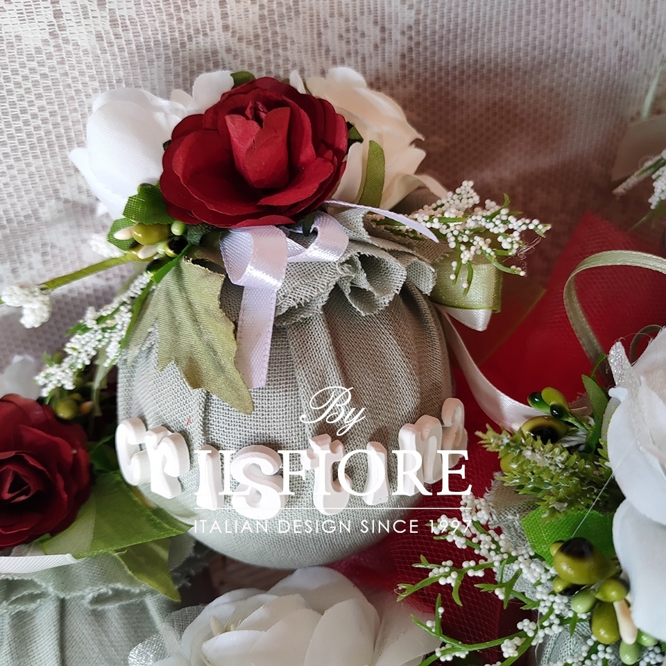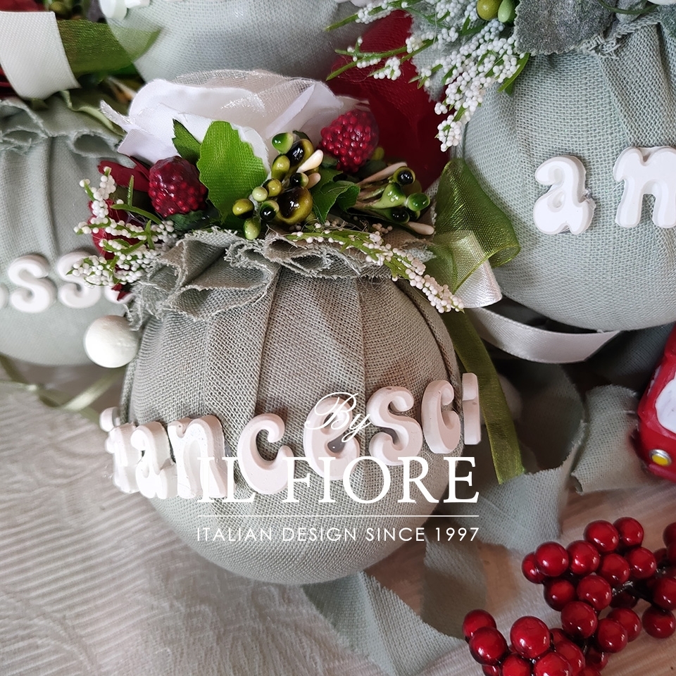 Palline natalizie per albero di Natale personalizzabile con nome e rivestite con stoffa verde salvia e fiori. Originale addobbo natalizio ma ideale anche come articolo da regalo. Compresa nel prezzo confezione regalo.