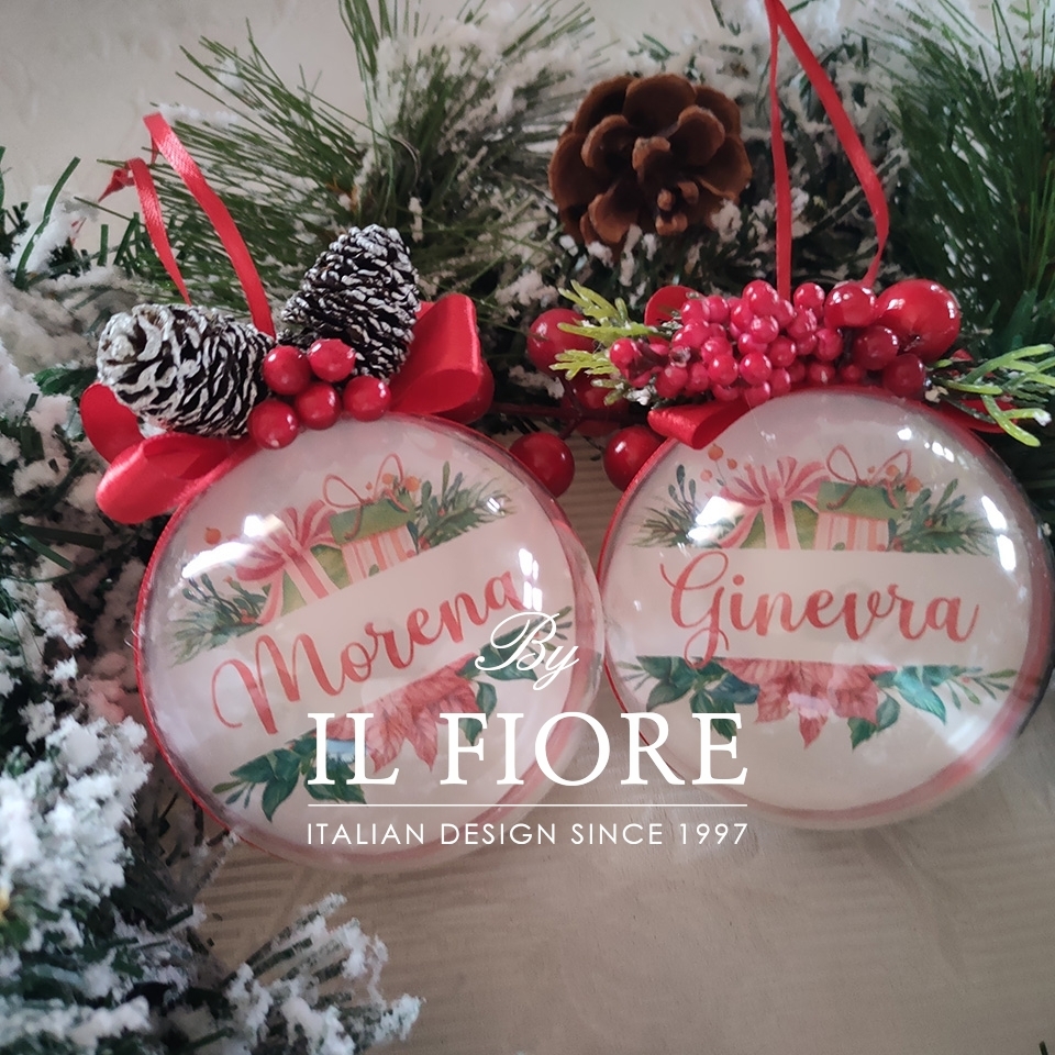 Palline di Natale personalizzabili con nome e decorate con bacche. Compresa nel prezzo confezione regalo.