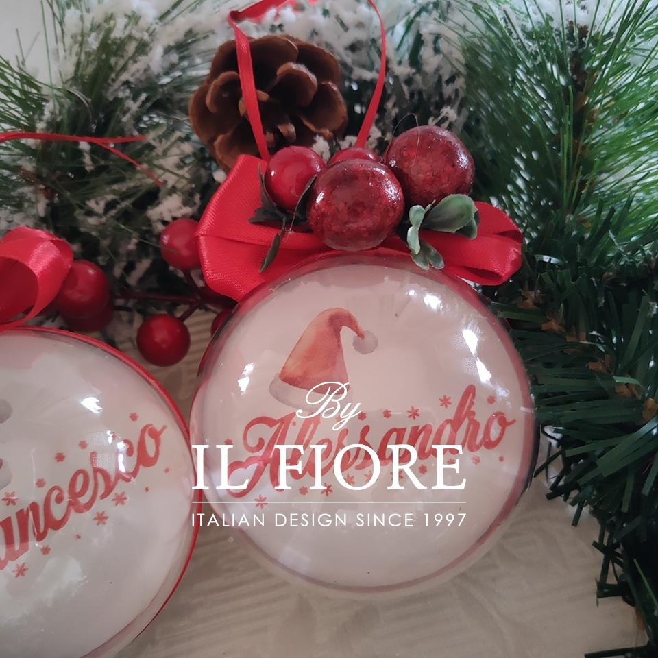 Palline di Natale personalizzabili con nome e decorate con bacche. Compresa nel prezzo confezione regalo.